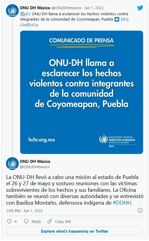 La Oficina en México del Alto Comisionado de las Naciones Unidas para los Derechos Humanos (ONU-DH) instó este miércoles a las autoridades a esclarecer la muerte de tres indígenas en enfrentamientos con la Policía en el estado de Puebla."Preocupa a la ONU-DH el uso excesivo de la fuerza por integrantes de la policía estatal. Este tipo de acciones no corresponde a una policía civil que actúa bajo estándares internacionales que establecen el uso estrictamente excepcional de la fuerza letal", expresó el organismo en un comunicado.El pasado 9 de mayo, en la población de Cobatzalco, municipio de Zoquitlán (Puebla), se dio un enfrentamiento en el que participaron efectivos de la policía estatal de Puebla y murieron tres miembros de la comunidad indígena Nahua de Coyomeapan -incluido un líder de la comunidad y un menor de edad- y otras seis más resultaron gravemente heridas.La ONU-DH insistió en que todo hecho en el que un agente estatal haya provocado la muerte a alguna persona debe investigarse "de manera completa, exhaustiva e independiente, en un plazo razonable" e indicó que el Estado debe aportar información para verificar si se cumplió con los Principios Básicos sobre el Empleo de la Fuerza y de Armas de Fuego.A partir de una misión en la que el organismo sostuvo reuniones con los sobrevivientes de los hechos y entrevistó a Basiliza Montaño Gutiérrez, defensora indígena de derechos humanos de Coyomeapan y actualmente privada de su libertad, ONU-DH sostiene que la hipótesis fundamental de investigación "es la relación entre las ejecuciones y la criminalización de las personas de Coyomeapan con la disputa por el control de los recursos naturales de la zona".Además, dictaminaron que también puede haber influido que desde verano de 2021 la Comunidad Nahua de Coyomeapan atraviesa un conflicto poselectoral.Ante esta situación, la ONU-DH "alienta" a las autoridades a implementar medidas de protección y a "respetar y garantizar el derecho al territorio y a la libre determinación".JM