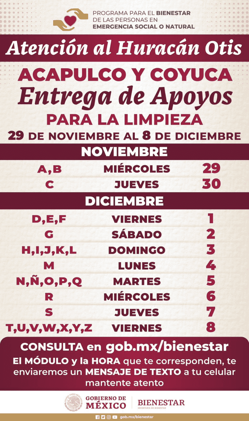 La Secretaría del Bienestar cuenta con tres programas sociales importantes a nivel nacional, Pensión para el Bienestar de las Personas Adultas Mayores, Pensión para el Bienestar de las Personas con Discapacidad y Becas para el Bienestar Benito Juárez.Si bien son los programas más amplios que han beneficiado tanto a grandes como a chicos, recientemente esta institución ha hecho un llamado a todos los mexicanos para que puedan acceder a un apoyo extra que estarán entregando hasta diciembre de 2023.Dicha ayuda tiene que ver con la entrega de productos de limpieza que la Secretaría del Bienestar comenzará a otorgar a partir del miércoles 29 de noviembre y finalizará el próximo viernes 8 de diciembre.Ariadna Montiel Reyes, titular de la Secretaría del Bienestar, a través de las redes oficiales hizo un llamado a los habitantes de los municipios de Acapulco y Coyuca de Benítez, Guerrero, a presentarse en el módulo del Bienestar correspondiente para que les sean entregados los artículos de limpieza.La documentación que deben presentar es la siguiente:Cabe señalar que esta entrega es parte de las acciones implementadas por el gobierno mexicano con el fin de reconstruir Guerrero tras el paso del huracán Otis a finales del pasado octubre.Sigue al día con las noticias, únete a nuestro canal de WhatsAppYC
