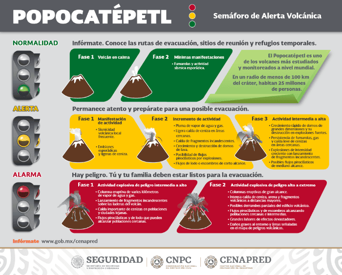 Ante el cambio en la actividad volcánica del Popocatépetl en las últimas semanas, autoridades determinaron elevar este jueves el Semáforo de Alerta Volcánica de amarillo fase 2 a fase 3.La tercera fase se aplica a una actividad intermedia a alta y refleja una medida preventiva que no considera evacuaciones.El Centro Nacional de Prevención de Desastres (Cenapred) explicó lo que implica la fase 3:La información que emita la Coordinación Nacional de Protección Civil al respecto puede seguirse por www.gob.mx/cenapred y en Twitter @CNPC_MXConsta de tres niveles y un total de siete fases, según la actividad del volcán. Cuando el semáforo está en verde, se encuentra en la normalidad; en el color amarillo, los ciudadanos deben estar atentos y preparados para una posible evacuación; el rojo significa peligro, por lo que pobladores deben estar listos para evacuarPor otra parte, las autoridades hacen una serie de recomendaciones en caso de caída de ceniza volcánica:IM