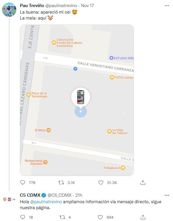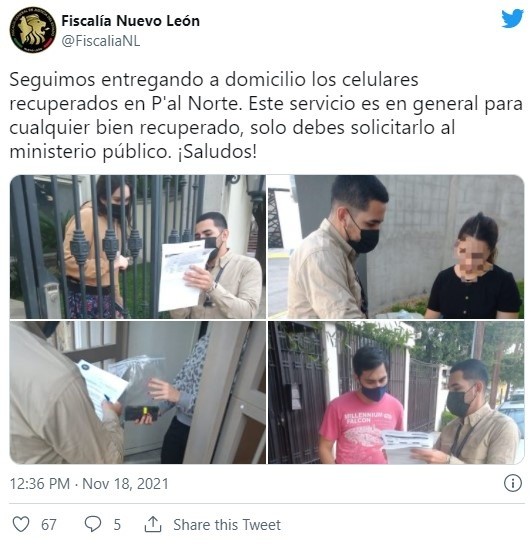 Una joven disfrutaba del festival masivo Pa'l Norte, en Nuevo León cuando momentos después de haber usado su celular ya no lo encontró, pues entre la multitud se lo robaron y días después supo que estaba en la Plaza de la tecnología, en la Ciudad de México."Estaba hablando por celular con un amigo y luego colgué y me lo guardé (el celular) en la chaqueta, regresé cinco metros hacia el lugar donde estaba (antes de la llamada) y cuando quise volver a agarrar mi celular ya no estaba", relata Paulina Treviño.El famoso festival se llevó a cabo los días sábado 13 y domingo 14 de noviembre, los hechos ocurrieron en la primera de las fechas; al día siguiente Paulina realizó su denuncia ante la Fiscalía General del estado de Nuevo León."Puse mi celular en modo 'perdido' y acudí a la fiscalía, puse la denuncia y me comentaron que en el transcurso de esa mañana muchas personas estaban poniendo el mismo tipo de denuncia".Paulina, de 27 años, comenta que recibió mensajes desde su dispositivo en el que le pedían enviara la contraseña para desbloquear su celular a que lo ella no accedió.La joven subió a su cuenta de Twitter una captura donde aparecía la ubicación en la Plaza de la Tecnología de la CDMX, y el Centro de Comando, Control, Cómputo, Comunicaciones y Contacto de la ciudad (C5), respondió a su publicación.Al comunicarse con el C5 esto le respondieron que debe "orientarse con las autoridades de su entidad federativa para las acciones correspondientes". La Fiscalía General de Nuevo León publicó hace unos días una lista con 23 celulares que fueron asegurados en el operativo de seguridad que se implementó en el festival.Las autoridades ofrecieron entregar a domicilio los aparatos a los dueños que acreditaran la propiedad.Este jueves la Fiscalía compartió algunas fotos de su personal entregando celulares a los afectados.Según la Encuesta Nacional de Victimización y Percepción sobre Seguridad Pública (ENVIPE) 2020 estima 205 mil robos o asaltos en calle y transporte público; siendo cada uno de ellos susceptible al retiro de teléfonos móviles. A nivel nacional se estima que el 56% de los robos o asaltos en calle y transporte público exista sustracción de estos dispositivos. AF