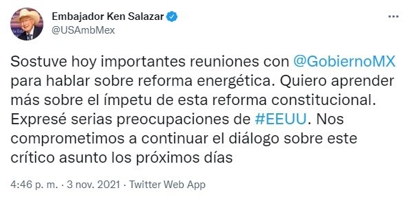 El embajador de Estados Unidos en México, Ken Salazar, manifestó "serias preocupaciones" de su país sobre la reforma eléctrica.En redes sociales, Salazar dijo que se reunió este miércoles con representantes del Gobierno mexicano para dialogar sobre la reforma."Sostuve hoy importantes reuniones con el Gobierno de México para hablar sobre la reforma energética. Quiero aprender más sobre el ímpetu de esta reforma constitucional. Expresé serias preocupaciones de Estados Unidos. Nos comprometimos a continuar el diálogo sobre este crítico asunto los próximos días", detalló.La reforma eléctrica de López Obrador causa controversia porque entrega un mínimo de 54% de la generación eléctrica a la Comisión Federal de Electricidad (CFE), empresa del Estado, y desaparece los reguladores autónomos de la energía.También nacionaliza el litio y cambia el criterio del despacho de electricidad para priorizar siempre las plantas hidroeléctricas y de combustibles fósiles de la CFE sobre las eólicas y solares de privados.A diferencia de iniciativas anteriores, el presidente ahora se ha mostrado abierto a cambios en el Congreso, donde su alianza de partidos perdió en los comicios intermedios de junio la mayoría calificada de dos tercios, necesaria para una reforma constitucional.Además, Salazar también acudió este día a la sede de la Suprema Corte de Justicia de la Nación (SCJN) de México, donde se reunió con el presidente del organismo, Arturo Zaldívar y el resto de la delegación del Gobierno de Estados Unidos integrada por el diplomático, el procurador asistente adjunto de EU, Bruce Swartz, y funcionarios del gobierno estadounidense."Durante la reunión, que buscó estrechar el diálogo y la colaboración entre los sistemas de justicia de México y los Estados Unidos de América, se trataron temas prioritarios para el Poder Judicial Federal y el Gobierno americano, tales como los avances en la consolidación del sistema penal acusatorio y la implementación de la reforma en materia laboral", informó la SCJN a través de un comunicado.IM