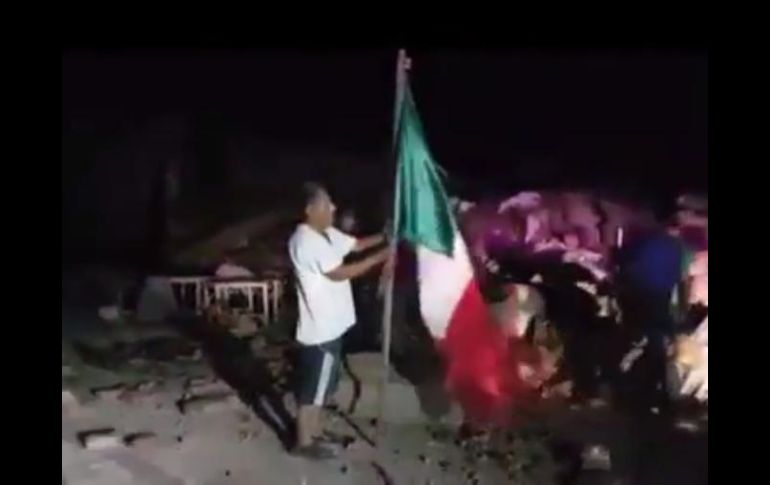 GUADALAJARA, JALISCO (08/SEP/2017).- Después del terremoto que sacudió al país la noche del jueves, cientos de imágenes han circulado en las redes sociales pero, hay una que destaca: se trata de la acción de un hombre que saca una Bandera de entre los escombros del Palacio Municipal de Juchitán.Las imágenes detrás de esta impactante escena han comenzado a circular en un breve video de poco más dos minutos. En la grabación se ve a un hombre, no identificado, rescatar el Lábaro y luego encuentra un "mástil" para colocarla. Con cuidado, amarra el lábaro patrio para resistir al viento que soplaba por la noche.Finalmente la Bandera ondea mientras está de pie, firme, sobre un pila de escombros del Palacio Municipal de Juchitán, Oaxaca, una de las poblaciones más afectadas durante el sismo.Estas imágenes han servido y han sido utilizadas para compartir mensajes de fuerza y apoyo a los afectados utilizando las etiquetas #PrayForMexico y #FuerzaMéxico.El último reporte oficial daba cuenta de 16 personas fallecidas, aunque ya se empiezan a manejar cifras extraoficiales que superan las tres decenas.EL INFORMADOR / PATRICIA GALLARDO