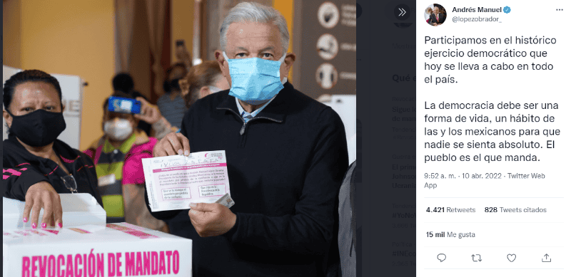 En las primeras horas de este domingo, el Presidente de México, Andrés Manuel López Obrador (AMLO) junto a su esposa, Beatriz Gutiérrez Müller acudieron a la casilla 4748 en el Museo del Arzobispado a emitir su voto para la revocación de mandato.Tal y como lo había advertido AMLO, anuló su votó pero quiso mostrar de qué manera lo había hecho mostrando su boleta ante sus seguidores en redes sociales.Fue así como AMLO compartió en redes sociales una fotografía donde se le ve sosteniendo la boleta en donde se lee: “¡Viva Zapata!”, algo que de manera inmediata anularía su participación.Es importante recalcar que para poder emitir tu voto y que sea válido, debes señalar si estás o no de acuerdo en que AMLO siga en la Presidencia de México, ya que después de esta publicación hubieron algunos usuarios que preguntaron si era la forma correcta de hacer valer su participación.Cerca de las 9:15 de la mañana, justo cuando AMLO emitió su voto se agolparon algunos de sus simpatizantes en su casilla para gritar y mostrar consignas a favor de su continuidad en el cargo.GC