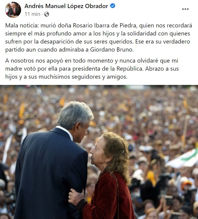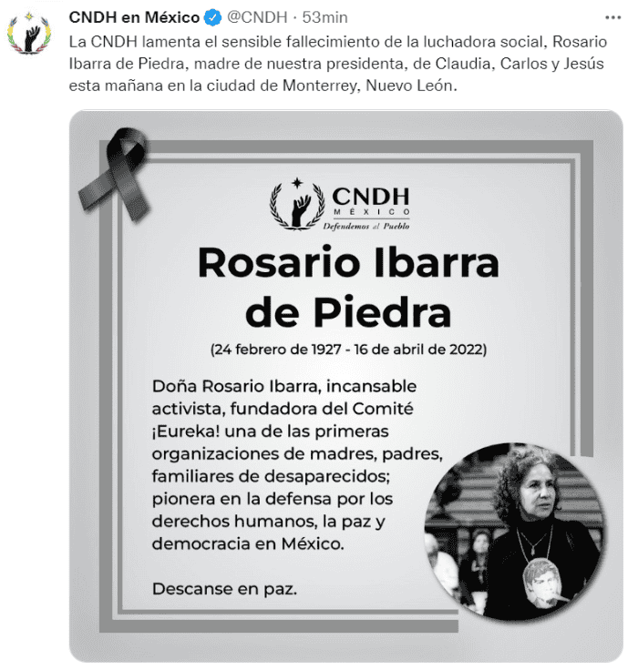 La activista de derechos humanos y defensora de los desaparecidos por cuatro décadas, Rosario Ibarra de Piedra, murió este sábado a los 95 años, informó la Comisión Nacional de Derechos Humanos de México (CNDH). “La CNDH lamenta el sensible fallecimiento de la luchadora social, Rosario Ibarra de Piedra, madre de nuestra presidenta, de Claudia, Carlos y Jesús esta mañana en la ciudad de Monterrey, Nuevo León”, señaló la dependencia en su cuenta oficial de Twitter. En la misma red social, la senadora Ifigenia Martínez lamentó el deceso de la luchadora social. “Me entero con tristeza del fallecimiento de mi entrañable amiga e incansable activista y luchadora social, Rosario Ibarra de Piedra, pionera en la defensa por los derechos humanos, la paz y democracia en México. Abrazo con afecto a sus hijas, familiares y amigos. Descanse en paz”, señaló. Dos veces candidata a la Presidencia de México, en 1982 y 1988, Ibarra fue madre de Jesús Piedra, miembro de la Liga Comunista 23 de Septiembre, un grupo armado clandestino, y quien fue capturado y desaparecido por la Dirección Federal de Seguridad en la década de 1970. En su lucha por localizar a su hijo, se unió a otras mujeres con familiares desaparecidos y en 1977 fue fundadora del Comité Eureka en defensa de los desaparecidos, perseguidos y exiliados en México. Ibarra también fue senadora en 2006 por el izquierdista Partido de la Revolución Democrática (PRD). En julio de 2019, la Cámara de Diputados le concedió la Medalla al Mérito Cívico "Eduardo Neri y Legisladores de 1913" que se otorga cada año a ciudadanos que se hayan distinguido sirviendo a la colectividad, a la República y a la humanidad, destacando por sus hechos cívicos, políticos o legislativos. Ese mismo año, el Senado mexicano le otorgó la medalla Belisario Domínguez, el mayor reconocimiento civil de este país. Además, junto con el ahora Presidente Andrés Manuel López Obrador (AMLO), protagonizó distintas luchas sociales en diversos lugares del país, como el alzamiento zapatista de 1994, la exigencia de detener y esclarecer el asesinato de mujeres en Ciudad Juárez, y las matanzas de personas indígenas en Chiapas y Guerrero, durante el Gobierno del presidente Ernesto Zedillo (1994-2000) Fue candidata al Premio Nobel de la Paz en los años de 1986, 1987, 1989 y 2006.OA