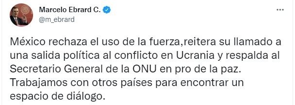 Luego de que el presidente de Rusia, Vladimir Putin, confirmara acción militar en algunas ciudades de Ucrania, el canciller de México, Marcelo Ebrard reaccionó ante tal decisión y expuso en su cuenta de Twitter la posición de México ante dicho conflicto: “México rechaza el uso de la fuerza, reitera su llamado a una salida política al conflicto en Ucrania y respalda al Secretario General de la ONU en pro de la paz”. Ebrard agregó que trabajarán de la mano con otros países para buscar el diálogo y recurrir a la diplomacia ante este conflicto.Sobre la situación de mexicanos en Ucrania, el canciller aclaró: “En comunicación con nuestra Embajada en Kiev. Están bien y reportan seguimiento activado para la protección de las familias mexicanas”.Hasta hace unos días, Marcelo Ebrard dijo que la embajada de México en Ucrania iba permanecer abierta y funcionando normalmente para atender cualquier emergencia de los compatriotas que requieran de apoyo.La invasión rusa en Ucrania sucedió hace unos momentos mientras se celebraba una reunión de la Comisión de Seguridad en de la ONU. En redes sociales y algunos medios de comunicación han confirmado ya algunas explosiones en ciudades al este de Ucrania.JL