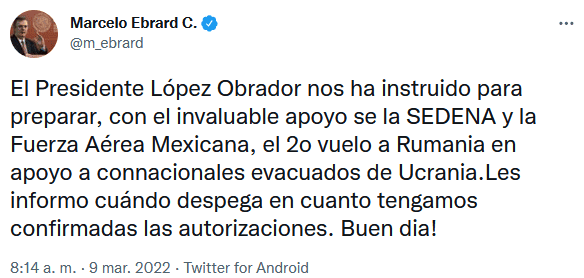 El Presidente Andrés Manuel López Obrador (AMLO) adelantó que hoy partirá un avión de la Fuerza Aérea Mexicana (FAM) a Rumanía para traer a mexicanos y latinoamericanos que permanecen en la zona de conflicto tras la invasión de Rusia a ese país."Lo que estamos haciendo es proteger a los mexicanos que están en Ucrania, hoy sale de nuevo un avión de la Fuerza Aérea para traer a mexicanos y latinoamericanos que no tienen cómo regresar a sus países, eso lo estamos haciendo y ayuda humanitaria para refugiados, para quienes ya están en campamentos y necesitan apoyos".En su conferencia de prensa "mañanera", el Presidente López Obrador dijo que la aeronave militar mexicana llevará ayuda humanitaria."Seguramente son alimentos, pero Relaciones Exteriores va a informar", dijo.En el caso de los mexicanos que no han podido salir de Rusia, AMLO aseveró que su gobierno dará facilidades para que puedan salir."Si se puede llegar a México desde Moscú, porque quedaron unos turistas rusos en Cancún y los están recogiendo, tienen que hacer un rodeo, pero en caso que se necesite ir a buscar a mexicanos a Rusia, podemos hacer lo mismo para traer a los mexicanos de Ucrania, esto lo puede informar el secretario de Relaciones Exteriores".El secretario de Relaciones Exteriores, Marcelo Ebrard, anunció que se enviará un segundo vuelo de la Fuerza Aérea Mexicana (FAM), para repatriar connacionales que salieron de Ucrania.A través de su cuenta de twitter, el canciller mexicano dijo, que apenas se tengan confirmadas las autorizaciones para mover el vuelo, se dará a conocer cuándo despegará."El Presidente López Obrador nos ha instruido para preparar, con el invaluable apoyo se la Sedena y la Fuerza Aérea Mexicana, el 2o vuelo a Rumania en apoyo a connacionales evacuados de Ucrania. Les informo cuándo despega en cuanto tengamos confirmadas las autorizaciones. Buen día!", difundió Ebrard.OA