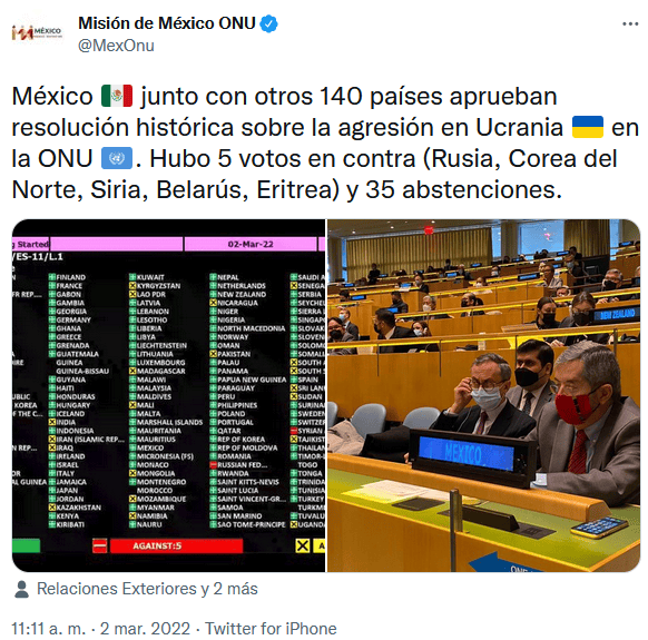 El embajador de México en Naciones Unidas (ONU), Juan Ramón de la Fuente, adelantó hoy que votará a favor de la resolución que se presentará hoy para condenar a Rusia por la invasión a Ucrania."México votará a favor de la resolución sobre la agresión contra Ucrania en la Asamblea General de la ONU", tuiteó De la Fuente.El tuit va acompañado de un video en el que el embajador recordó que "México, junto con otros 10 países del Consejo de Seguridad de la ONU invocó la resolución Unión Pro Paz para convocar a una sesión de emergencia a la Asamblea General y que esta pudiera a su vez analizar y resolver sobre la situación en Ucrania".Señaló que tras el intenso debate que se ha producido en la Asamblea en los últimos dos días, hoy "se pondrá a votación una resolución sobre la agresión en Ucrania". México, dijo, "va a votar a favor de esta resolución" que, explicó, "contiene muchos de los argumentos que hemos esgrimido en diversos foros con relación al tema e incluye además una cláusula que hemos propuesto para dejar abierta la puerta de la diplomacia por donde tendrá que venir finalmente la solución al conflicto".El proyecto de resolución fue presentado por Estados Unidos junto con decenas de países, entre los que no están los dos grandes de Latinoamérica, México y Brasil.De la Fuente señaló que, a la par de esta resolución, México ha estado trabajando "junto con Francia en otro proyecto para tratar de garantizar que la ayuda humanitaria llegue de manera oportuna a la población civil que está sufriendo ya grandes estragos como consecuencia de este conflicto". En días pasados, De la Fuente dejó en claro que México considera lo ocurrido como una "invasión" de Rusia a Ucrania, que es "inaceptable".De la Fuente aludió a los desplazados internos y a los más de 600 mil refugiados que están en países vecinos. "La situación humanitaria es preocupante", dijo, "y todo muestra que se va a complicar aún más en los próximos días".El diplomático mexicano subrayó que los planteamientos que ha hecho México son de conformidad con las instrucciones recibidas por parte del Presidente Andrés Manuel López Obrador y de la Cancillería "son muy claros: un llamado al cese al fuego inmediato, protección a la población civil y acceso a la ayuda humanitaria sin restricciones". Además, "no cancelar la vía diplomática y mantener todo el diálogo que se ha posible en los diversos foros multilaterales".OA