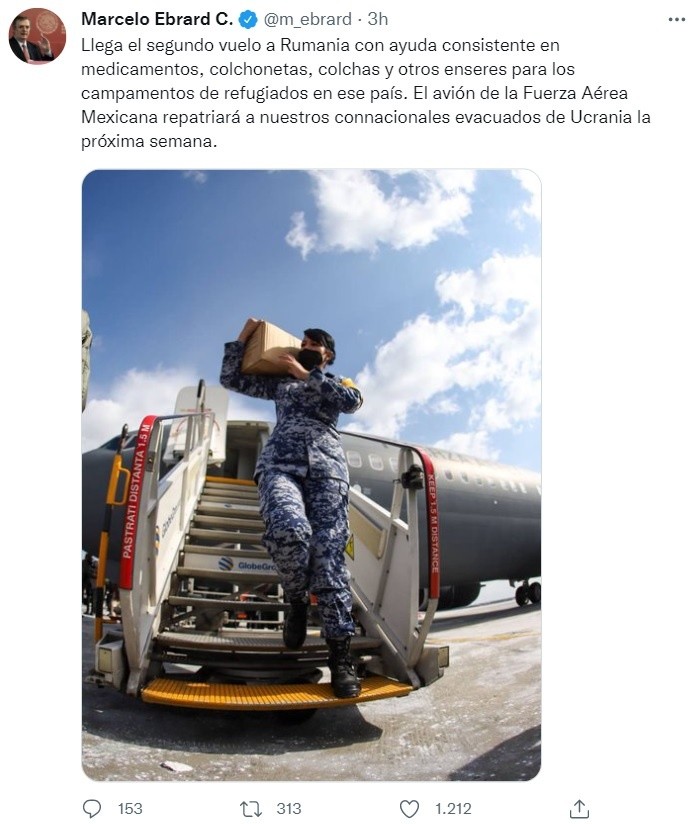Marcelo Ebrard, secretario de Relaciones Exteriores (SRE), informó que arribó el segundo vuelo de la Fuerza Aérea Mexicana con ayuda humanitaria para refugiados en Rumania.A través de su cuenta de Twitter, Ebrard detalló que dicho vuelo también traerá de vuelta a los mexicanos evacuados de Ucrania por la invasión rusa."Llega el segundo vuelo a Rumania con ayuda consistente en medicamentos, colchonetas, colchas y otros enseres para los campamentos de refugiados en ese país"."El avión de la Fuerza Aérea Mexicana repatriará a nuestros connacionales evacuados de Ucrania la próxima semana."El funcionario precisó que el avión regresará a la Ciudad de México con nuestros connacionales próxima semana.OA