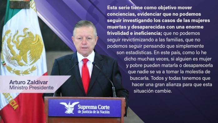 En junio próximo, la Suprema Corte de Justicia de la Nación (SCJN) lanzará la serie documental "Caníbal, indignación total", con el objetivo de generar conciencia sobre la violencia feminicida que azota al país.Arturo Zaldívar, presidente del máximo tribunal, presentó este miércoles el primer video promocional de la serie que iniciará con el caso del feminicida de Atizapán, Andrés Mendoza, el 27 de junio a través de un canal de televisión abierta."Esta serie la venimos trabajando desde hace 11 meses y se inserta en la tradición de esta Suprema Corte de usar el arte para generar denuncias y para evidenciar injusticias", reveló el ministro en conferencia de prensa.En la sede de la SCJN, en el centro histórico de la capital del país, Zaldívar afirmó que desde hace varios años se ha demostrado en el mundo que a través de series documentales se puede cambiar la cultura y mover la conciencia de las personas."Las series son hoy un instrumento extraordinariamente poderoso de comunicación y me parece que ante un tema tan delicado y terrible como el de los feminicidios en México, todos tenemos que tratar de que las cosas cambien y una forma de que las cosas cambien es generar conciencia para modificar cultura", comentó.