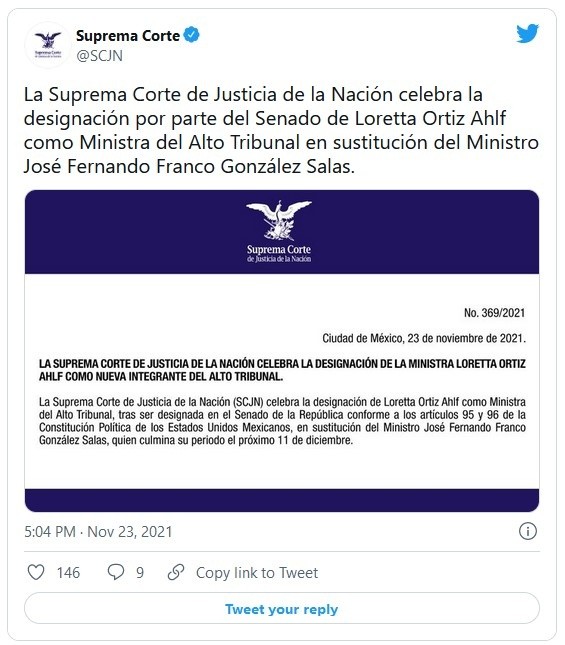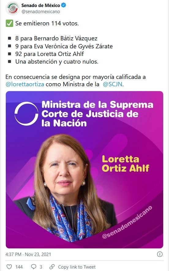 Con 92 votos a favor, el pleno del Senado de la República eligió a Loretta Ortiz Ahlf como nueva ministra de la Suprema Corte de Justicia de la Nación (SCJN), quien tomará posesión el próximo 12 de diciembre en sustitución de Fernando Franco González Salas, al concluir su periodo de 15 años como ministro.En una sola ronda de votación, Ortiz Ahlf logró la mayoría calificada de dos terceras partes de los senadores presentes en la sesión, que exige la Constitución, con lo que se convirtió en la última ministra que se integra a la SCJN durante el sexenio del Presidente Andrés Manuel López Obrador (AMLO).De esta manera, el pleno de la Suprema Corte se integra ahora por siete varones y cuatro mujeres.Del resto de la terna propuesta, Verónica de Gyvés obtuvo nueve votos, mientras que el tercer aspirante, Bernardo Bátiz, alcanzó ocho votos a favor.A través de redes sociales el ministro presidente de la Suprema Corte de Justicia de la Nación (SCJN), Arturo Zaldívar, felicitó a la nueva integrante del Máximo Tribunal, Loretta Ortiz Ahlf.Zaldívar indicó, en un mensaje posteado en su cuenta de Twitter, que con la llegada de la ahora exconsejera de la Judicatura Federal a la Corte la institución avanza a la paridad de género."Felicito a la ministra Loretta Ortiz Ahlf. Con su llegada a la #SCJN avanzamos hacia la paridad de género. Estoy seguro, porque conozco su destacada trayectoria, que será una defensora consistente de los #DDHH de todas las personas", publicó el ministro presidente.JM