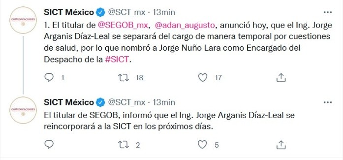 Jorge Arganis Díaz Leal se separará temporalmente de la Secretaría de Infraestructura, Comunicaciones y Transportes (SCT) por cuestiones de salud, así lo informaron fuentes del Gobierno federal.La tarde del pasado jueves 1 de septiembre, Jorge Arganis estuvo en Palacio Nacional para escuchar el mensaje del Presidente Andrés Manuel López Obrador con motivo de su Cuarto Informe de Gobierno.Arganis fue designado en la SCT el 2020, en sustitución de Javier Jiménez Espriú.Jorge Arganis Díaz Leal es ingeniero civil egresado de la Facultad de Ingeniería de la Universidad Nacional Autónoma de México (UNAM), donde también ha sido profesor durante casi tres décadas.Fue Director General de Obras Públicas del Gobierno de la Ciudad de México.Ha ocupado los cargos de tesorero y presidente de la Sociedad de Alumnos de la Facultad de Ingeniería; presidente de la Generación 60, coordinador general de la Asamblea de Generaciones y consejero de la Cámara Nacional de la Industria de la Construcción.En el Colegio de Ingenieros Civiles de México ha sido coordinador de diversos Comités, secretario del XVI Consejo Directivo, vicepresidente del XXIII Consejo Directivo y presidente del XXV Consejo Directivo; representante por parte de México en la Federación Iberoamericana de Ingeniería Civil y Construcción.Ha sido miembro del Comité Mexicano para la Práctica Internacional de la Ingeniería, en el Marco del Tratado de Libre Comercio y vicepresidente del Área Civil de la Unión Mexicana de Asociaciones de Ingeniería (UMAI). Fue Coordinador del Comité de Ética y Profesionalismo del North American Alliance for Civil Engineering (NAACE).Asimismo, socio fundador de Causa Ciudadana, A.P.N. y primer coordinador del Grupo Ingenieros para el Cambio (INPAC), organizaciones políticas plurales.La Asamblea de Generaciones de la Facultad de Ingeniería de la UNAM le otorgó el Reconocimiento a la Actividad Gremial en 1985, la Texas Society of Professional Engineers lo designó socio honorario en 1993 y en 1998 el Colegio de Ingenieros Civiles de México le otorgó la calidad de Miembro Emérito.JM