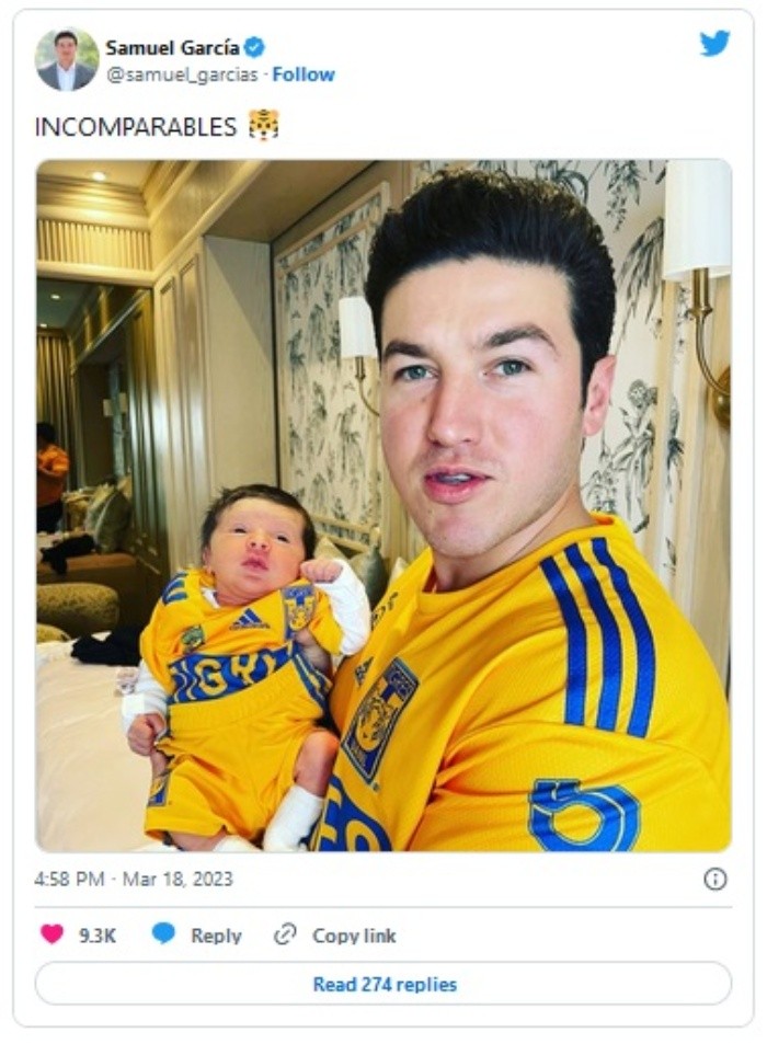 El gobernador de Nuevo León, Samuel García, presumió a su hija recién nacida con un outfit que ha sido tema de controversia entre él y su esposa, Mariana Rodríguez, desde antes que naciera la pequeña.Y es que Mariel, hija del gobernador y de la presidenta de Amar a Nuevo León, portó este sábado el uniforme del Club Tigres, equipo de futbol al que Samuel García le va, en contraste con el equipo de Mariana Rodríguez, quien es aficionada a los Rayados.Lo anterior en vísperas del Clásico regio de Tigres contra Monterrey, quienes jugaron su encuentro deportivo este sábado en el estadio Universitario, quedando con un marcador de 1-0 a favor de los Rayados.En redes sociales, el gobernador Samuel García publicó una foto de él y su esposa eligiendo el uniforme deportivo que portaría la nueva integrante de la familia.Posteriormente, el mandatario neoleonés publicó con una foto el outfit ganador para ese encuentro deportivo, dejando ver que la pequeña Mariel vistió el uniforme de Tigres UANL.La nueva pareja de papás ha mostrado en redes sociales que la pasión por sus equipos va más allá de sus gustos, pues ahora también hicieron partícipe del debate a su bebé.JM