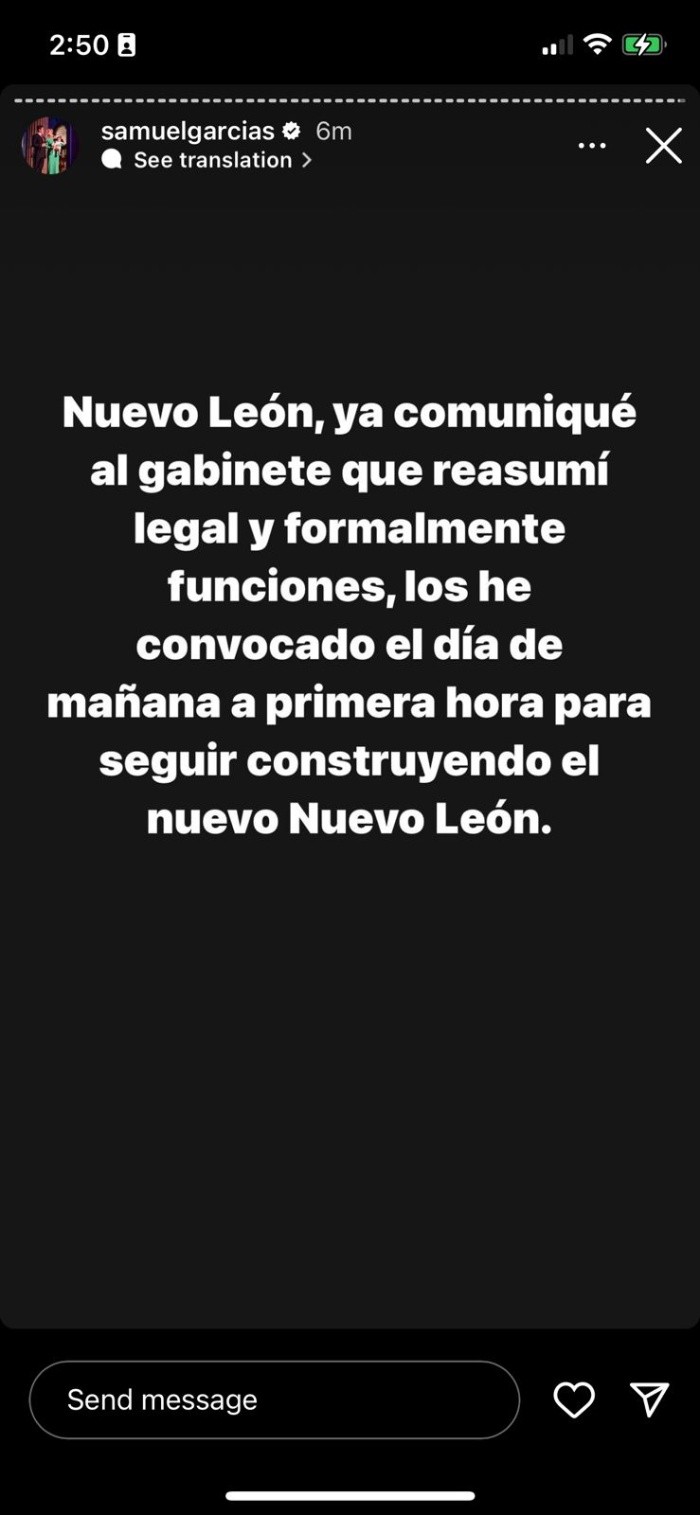 Luego de días caóticos en el estado de Nuevo León, Samuel García regresa a la gubernatura, luego de que en la madrugada de este viernes se publicara en el periódico oficial de la entidad un acuerdo que así lo establece, por lo que, todo indica, dejará la precandidatura de Movimiento Ciudadano a la presidencia.En una declaración, Javier Navarro, secretario de gobernación, dio a conocer que se publicaba en el periódico oficial del estado el acuerdo con el cual García retoma sus funciones como gobernador, tan solo unos minutos después de que Luis Enrique Orozco hubiera tomado protesta como interino.Ante una pregunta directa de uno de los reporteros presentes en el lugar, Navarro aseguró que Samuel "no se va a la campaña" y tras responder, procedió a abandonar el Palacio de Gobierno.Samuel García, que se encontraba dentro del inmueble, también salió con el rostro desencajado en medio de cuestionamientos de los medios de comunicación pero sin decir ni una palabra. Cerca de las 03:00 horas de la mañana, García publicó una imagen a través de sus Instagram Stories en la que señala:“Nuevo León, ya comuniqué al gabinete que reasumí legal y formalmente funciones, los he convocado el día de mañana a primera hora para seguir construyendo el nuevo Nuevo León”. Tan solo unas horas antes, Samuel había celebrado una victoria luego de una resolución que aseguraba que Javier Navarro debería de ser nombrado el gobernador interino, sin embargo, la Suprema Corte de Justicia de la Nación fue quien emitió un comunicado en el que ordenó que fuera Luis Enrique Orozco quien asumiera funciones. Orozco llegó hasta Palacio de Gobierno para tomar protesta y después atender a los medios de comunicación, fue en esa intervención que Navarro le comunicó la decisión de García.