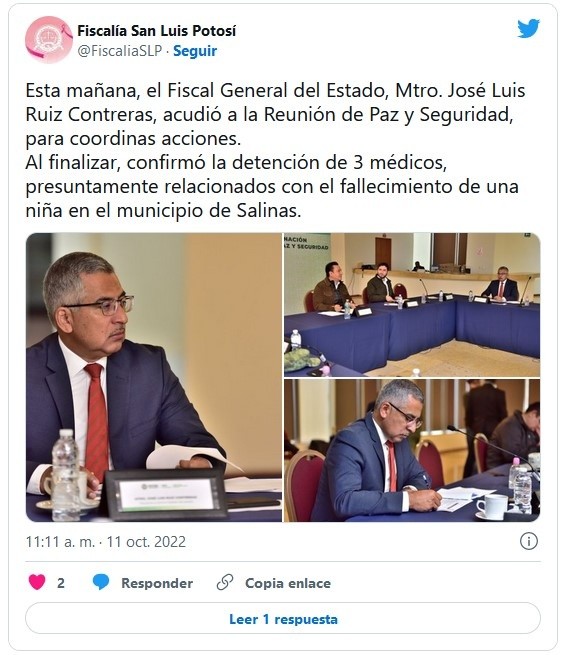 La Fiscalía General del Estado de San Luis Potosí informó que tres médicos relacionados con la muerte de Camila, una menor de tres años de edad, fueron aprehendidos por el delito de Comisión de Homicidio por Omisión.Tras obtener los datos de prueba que integró el Ministerio Público, se judicializó la carpeta de investigación y se obtuvieron los mandamientos de captura que ejecutó la Policía de Investigación. Dos de las detenciones tuvieron lugar en San Luis Potosí y otra más en Zacatecas.Los sospechosos fueron trasladados al Centro de Reinserción Social de La Pila, para que comiencen con su proceso legal a través de la audiencia inicial.Los hechos por los que los médicos son investigados ocurrieron en agosto, cuando la menor fue declarada muerta por un supuesto choque hipovolémico. La madre llevó a Camila para atención médica, y dicho personal le extendió un primer certificado de defunción por un supuesto choque hipovolémico.En el velorio, la niña mostró signos de que estaba con vida y nuevamente la llevaron a un hospital; sin embargo, nada se pudo hacer, y la pequeña falleció poco después.JM