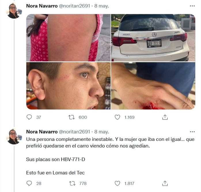 La tarde de ayer domingo 8 de mayo se denunció en Facebook la agresión que sufrieron dos jóvenes potosinos en la colonia Lomas del Tecnológico, en San Luis Potosí, de parte de un hombre al que le habían comentado que estaba mal estacionado.Nora “N” publicó en su perfil personal que únicamente le mencionaron al sujeto que los golpeó, que se encontraba mal estacionado, que les permitiera estacionarse.Al mediar estas palabras, el hombre, quien estaba en una SUV Acura con placas HBV-771-D, bajó con el bastón del carro en la mano y comenzó golpear al novio de Nora “N”.Ella comenzó a grabar, mientras le mencionaba que llamaría a la policía, a lo que el sujeto reaccionó de forma más violenta.“¿Cuál policía?” le gritó y golpeó, momento en que se detiene la grabación.“Una persona completamente inestable. Y la mujer que iba con él igual… que prefirió quedarse en el carro viendo cómo nos agredían”.La joven posteó en sus redes imágenes de las lesiones que sufrieron y piden que las autoridades investiguen a Rafael "N", responsable del ataque que fueron víctimas la tarde del domingo.DO