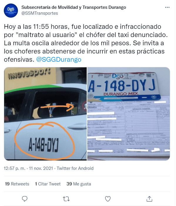 Tras darse a conocer que autoridades de Durango localizaron a un autobús del transporte público en el que se leía la frase “gordas pagan x kilo”, una nueva sanción por el mismo concepto fue emitida ahora a un taxi señalado en redes sociales por incluir un mensaje ofensivo en contra de personas con sobrepeso.Según lo dado a conocer por la Subsecretaría de Movilidad y Transportes de Durango a través de su cuenta en Twitter, a las 20:30 horas del pasado 10 de noviembre de 2021 fue localizada la unidad señalada por usuarios en redes sociales en las que se exhibía el mensaje "gordas pagan x kilo (sic)"; la denuncia se había hecho un día anterior mediante una fotografía de la unidad.En la publicación se da a conocer que el autobús de la Alianza de Camioneros con número económico 41, además de contener el mensaje que vuelve acreedor de una infracción por concepto de maltrato al usuario, también fue sancionada por no contar con tarjetón ni licencia del conductor.Un día después, la dependencia informó que a las 11:55 horas del 11 de noviembre, fue localizado e infraccionado por el mismo concepto el chofer de un taxi, acreedor a una multa que oscila alrededor de los mil pesos. En la denuncia hecha vía redes sociales, se adjunta una fotografía del vehículo en donde se aprecia a detalle la matrícula en una puerta trasera, en cuyo vidrio fue colocada una calcomanía en la que se lee "No subo gordas".Tras recibir las denuncias y proceder conforme a lo establecido en los Artículos 151 y 153 del Reglamento de la Ley de Transportes para el Estado de Durango, la Subsecretaría de Movilidad y Transportes hizo un llamado a los conductores de este tipo de vehículos a abstenerse de esta práctica.RG
