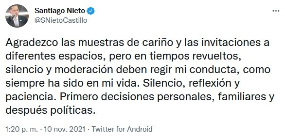 Santiago Nieto escribió hoy un mensaje en redes sociales, luego de anunciar el 8 de noviembre su renuncia como titular de la Unidad de Inteligencia Financiera (UIF), en que se refirió a los "tiempos revueltos" por los que atraviesa.Nieto no había hecho declaraciones tras informar de su salida de la UIF en medio de la polémica por su boda en Guatemala."Agradezco las muestras de cariño y las invitaciones a diferentes espacios, pero en tiempos revueltos, silencio y moderación deben regir mi conducta, como siempre ha sido en mi vida. Silencio, reflexión y paciencia. Primero decisiones personales, familiares y después políticas", publicó esta tarde en su cuenta oficial de Twitter.Esta mañana, el Presidente Andrés Manuel López Obrador (AMLO) calificó de buena la decisión de Nieto de haber renunciado.En su conferencia en Palacio Nacional, el Presidente también defendió la designación de Pablo Gómez Álvarez en la UIF."Pues yo pienso que fue una buena decisión de Santiago Nieto de presentar su renuncia y creo que también fue una decisión el nombramiento de Pablo Gómez, es un hombre íntegro, honesto, incorruptible. ¿Tengo que decir más?", expresó.Con información de SUNIM