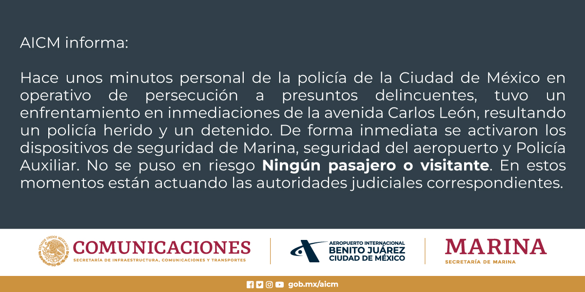 Durante la tarde de este martes, en el Aeropuerto Internacional de la Ciudad de México (AICM) se reportó una balacera en la Terminal 1. A través de un comunicado compartido a través de la plataforma "X", anteriormente Twitter, el AICM informó que personal de la policía de la ciudad comenzó un operativo de persecusión contra presuntos delincuentes.Durante el operativo un policía resultó herido tras el enfrentamiento que se llevó a cabo en las inmediaciones de la avenida Carlos León. Como resultado de la movilización estuvo un policía herido de bala y un detenido.De acuerdo con el AICM, se activaron los dispositivos de seguridad de Marina, seguridad del aeropuerto y Policía Auxiliar. Afortunadamente, no se puso en riesgo a nigún pasajero o visitante.El Vicealmirante Carlos Ignacio Velázquez Tiscareño, director del AICM dio declaraciones a la prensa en la que reporta que el policía tuvo tres heridas de bala y golpes en el cuerpo, sin embargo, se encuentra fuera de peligro.Se le cuestionó si estaba al tanto de los presuntos rumores de ladrones de una "banda" que se dedica a asaltar en la zona del aeropuerto. A esto, el Vicealmirante reportó que se encuentra en investigación.Actualmente se encuentra cerrada la puerta 2 de la Termina 1 ya que aún cartuchos e indicios delito, pero las operaciones del aeropuerto operan con regularidad.Por su parte, se reportó otro agente herido: una mujer policía fue atropellada, de acuerdo a la SSC, sin embargo, hasta el momento no se ha dado detalles sobre su estado de salud.MM