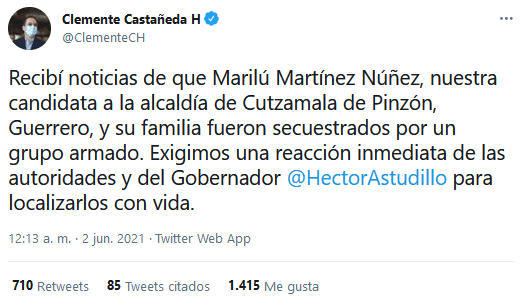 Un grupo armado secuestró a Marilú Martínez Núñez, candidata de Movimiento Ciudadano (MC) a la presidencia municipal de Cutzamala de Pinzón, en el estado de Guerrero, y a su familia, informó este miércoles el partido."Fueron secuestrados por un grupo armado. Exigimos una reacción inmediata de las autoridades y del gobernador Héctor Astudillo para localizarlos con vida", denunció en la madrugada Clemente Castañeda, coordinador nacional de MC.Aunque ni la dirigencia del partido ni las autoridades han detallado la hora y el lugar del suceso, Martínez Núñez hizo publicaciones en sus redes sociales por última vez durante la tarde del martes.Horas después, el gobernador de Guerrero, Héctor Astudillo, informó en Twitter que se desplegó un operativo de "búsqueda y rescate" para localizar a Martínez Núñez."Desde el momento en que se recibió la noticia de la desaparición de la candidata a la alcaldía de Cutzamala de Pinzón, Marilú Martínez Núñez, los integrantes de la Mesa Estatal para la Construcción de la Paz tomamos acciones de manera inmediata para su localización", indicó.El crimen ocurre mientras México acumula más de 780 agresiones o delitos globales contra políticos, con un saldo de 89 políticos asesinados, 35 de ellos aspirantes, según la consultora Etellekt, referente en el tema.Candidatos de MC han sido víctimas de alto perfil, como Alma Rosa Barragán, aspirante a la presidencia municipal de Moroleón, en Guanajuato, y Abel Murrieta, quien buscaba ser alcalde de Cajeme, en Sonora, donde fue procurador y abogado de víctimas de una masacre de mormones."Este periodo electoral es el más violento de la historia. No puede ser posible que participar en la política signifique arriesgar tu vida", tuiteó el partido este martes.Martínez Núñez, quien se define como una "joven entusiasta" había cerrado su campaña el 30 de mayo con un evento en una zona conocida como La Curva de Cutzamala.El municipio pertenece a una zona conocida como Tierra Caliente, que en la última década se ha vuelto una zona con presencia del crimen organizado y el narcotráfico."A las autoridades de Guerrero le exigimos que hagan su parte, Marilú Martínez y su familia deben aparecer ya. Ante estos lamentables hechos no puede caber la indiferencia. Hagan su parte. Exigimos elecciones seguras", demandó Jessica Ortega, coordinadora nacional de Mujeres de MC.GC