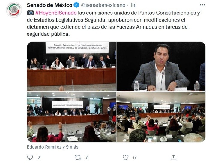 Con el voto en contra del PAN, Movimiento Ciudadano y Grupo Plural, y la división entre priistas, las comisiones unidas de Puntos Constitucionales y de Estudios Legislativos, Segunda, aprobaron un nuevo dictamen con proyecto de Decreto para reformar el artículo quinto transitorio y ampliar hasta 2028 el plazo que tienen las Fuerzas Armadas para participar en labores de seguridad pública.Al dar lectura al documento, elaborado por Morena y legisladores del PRI y otros grupos parlamentarios, la senadora morenista Lucy Meza señaló que entre los cambios a la minuta original que envió la Cámara de Diputados está la obligación del Gabinete de Seguridad de rendir cuentas, que sea improrrogable la fecha límite de marzo de 2028 para el retiro del Ejército y la Marina de las calles y la creación de un fondo de apoyo al fortalecimiento de las instituciones de seguridad pública locales.Sobre este tema, se proyecta que a partir del ejercicio fiscal 2024, el Ejecutivo Federal establecerá un fondo de apoyo a las entidades federativas y municipios destinado al fortalecimiento de sus instituciones de seguridad pública."Dicho fondo se establecerá de forma separada e identificable respecto de cualquier otro ramo o programa destinado a otros propósitos en el Presupuesto de Egresos de la Federación, y no podrá ser inferior en términos porcentuales al incremento que reciba la Fuerza Armada permanente y la Guardia Nacional para tareas de seguridad pública cada año. Los recursos de dicho fondo no podrán ser utilizados para otro fin".El documento indica que el Ejecutivo Federal presentará al Congreso de la Unión un informe semestral (…) proporcionando los indicadores cuantificables y verificables que permitan evaluar los resultados obtenidos en el periodo reportado en materia de seguridad pública, y corroborar el respeto a los derechos humanos y a los de los pueblos y comunidades indígenas y afromexicanas."Para el análisis y dictamen de los informes establecidos en el párrafo anterior, a partir del primer semestre del año 2023 y hasta la conclusión del plazo señalado en el primer párrafo, se integrará una comisión bicameral, en los términos que acuerden los órganos de dirección política de las Cámaras del Congreso de la Unión".El dictamen establece que esta comisión se reunirá las veces que sean necesarias; para la emisión del dictamen semestral convocará, si así lo requiere, a los titulares de las secretarías de Gobernación, de Seguridad y Protección Ciudadana, de Defensa Nacional y de Marina. El dictamen evaluará el cumplimiento de las condiciones establecidas "para la participación de la Fuerza Armada permanente en labores de seguridad pública y deberá señalar aquellas entidades federativas donde deje de ser requerida la presencia permanente de las Fuerzas Armadas en esas labores".El dictamen fue aprobado con 19 votos a favor, 10 en contra y una abstención del perredista Miguel Ángel Mancera.Este martes será presentado en la sesión del Pleno para su discusión y votación, donde a diferencia de la sesión del pasado 21 de septiembre, cuando fue devuelto a comisiones, ahora el grupo oficialista cuenta con el respaldo de más senadores del PRI, además de que, a decir de Ricardo Monreal, los 61 senadores de Morena votarán a favor, lo que podría ser definitivo para alcanzar la mayoría calificada; es decir, las dos terceras partes de los legisladores presentes.El nuevo dictamen con proyecto de Decreto que reforma la constitución para ampliar el plazo que tienen las fuerzas armadas para participar en tareas de seguridad pública incluye:JM