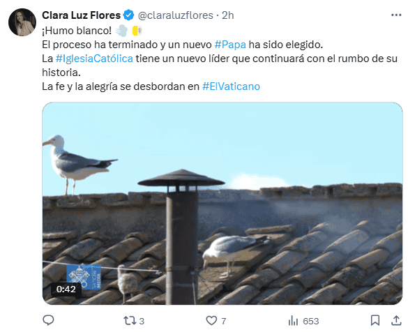 Este jueves, el cardenal Robert Francis Prevost fue electo como el nuevo Papa de la Iglesia Católica, y a partir de este momento, durante su pontificado, será conocido como León XIV por decisión personal.La titular de la Unidad de Asuntos Religiosos, Prevención y Reconstrucción del Tejido Social de la Secretaría de Gobernación (Segob), Clara Luz Flores, celebró el hecho a través de un mensaje en sus redes sociales."El proceso ha terminado y un nuevo Papa ha sido elegido. La Iglesia Católica tiene un nuevo líder que continuará con el rumbo de su historia", expresó."La fe y la alegría se desbordan en El Vaticano", añadió.Recientemente, Flores acompañó a la secretaria de Gobernación, Rosa Icela Rodríguez, al Vaticano a expresar sus condolencias a nombre de México por el fallecimiento de Francisco.* * * Mantente al día con las noticias, únete a nuestro canal de WhatsApp * * *MB