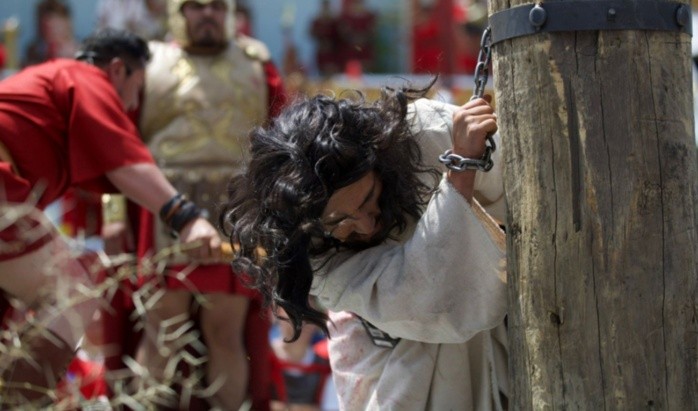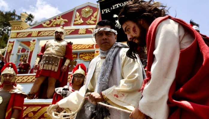 Este año representa a Jesús, David Uriel González Martínez, originario del barrio de San Lucas, quien llegó a la Macroplaza Cuitláhuac para la escenificación de los pasajes bíblicos e inicio del Viacrucis que implica las tres caídas y crucifixión en el Cerro de la Estrella.