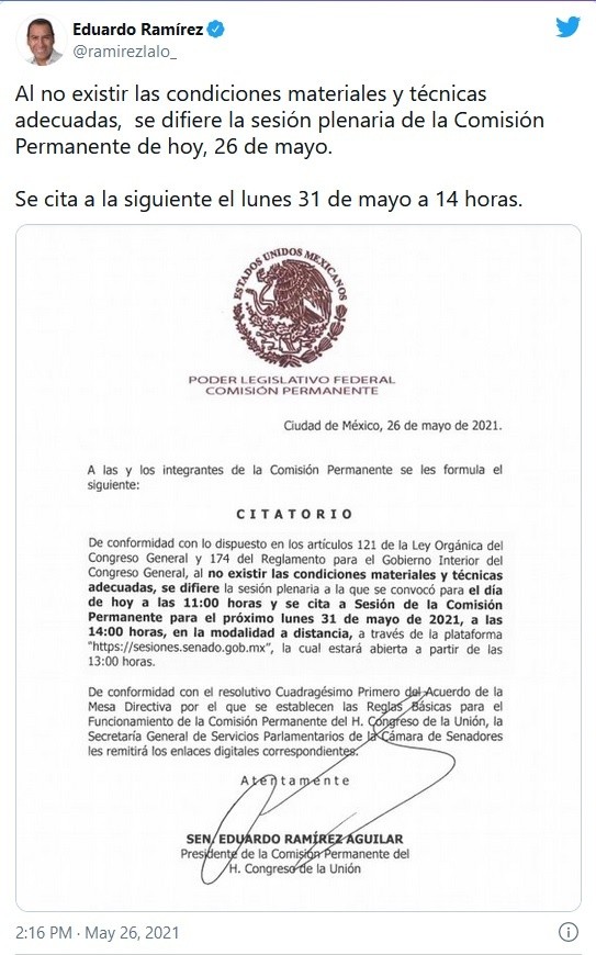 Debido al bloqueo del Senado de la República por manifestantes del Estado de México, la sesión semipresencial de la Comisión Permanente, programada para este miércoles, se pospuso para el lunes 31 de mayo.El presidente de la Mesa Directiva, Eduardo Ramírez, argumentó que se tomó esta decisión ante la falta de condiciones materiales y técnicas adecuadas para llevar a cabo los trabajos de la Comisión Permanente."Al no existir las condiciones materiales y técnicas adecuadas, se difiere la sesión plenaria a la que se convocó para el día de hoy a las 11:00 horas y se cita a la Sesión de la Comisión Permanente para el próximo lunes 31 de mayo de 2021, a las 14:00 horas, en la modalidad a distancia", se lee en el citatorio emitido por la mesa directiva.Entrevistados afuera del recinto, senadores y diputados del PAN y el PRI acusaron "mano negra" para impedir que la sesión en la que se debatirían temas importantes "que a Morena no le convienen", como la violencia en el proceso electoral y la Línea 12 del Metro.El senador priísta Manuel Añorve remarcó que la manifestación que bloqueó los accesos del Senado no tiene nada que ver con el poder legislativo, "pero sí con una mano negra que no le interesa debatir los problemas más graves del país".Y aunque no quiso responsabilizar directamente a nadie de Morena, aseguró que "lo que se ve no se juzga"."Vendedores ambulantes que no tienen nada que ver con el Senado de la República, y solicitantes de créditos que también no tiene nada que ver el Senado. Aquí está Fovissste a una cuadra. Sería muy fácil terminar esta negociación y llevarlos a las instancias de gobierno federal, del gobierno de la Ciudad de México para que les otorguen sus créditos o les den una explicación", apuntó.El coordinador de los senadores del PAN, Julen Rementería, exigió al presidente de la Mesa Directiva, Eduardo Ramírez, que no retrasara más la sesión de la Permanente."Inexplicablemente no se puede llevar a cabo una sesión que es a distancia, cuando la plataforma puede desarrollarse más allá de que estemos dentro del recinto o no. Aquí están legisladores de distintos partidos, que por supuesto estarían en condiciones de poder participar. Ya hay quorum en la propia sesión abierta de manera virtual e inexplicablemente no hay sesión", reprochó.El líder del PAN en el Senado aseguró que los legisladores de Morena y sus aliados tienen miedo a debatir los temas que no les convienen a unos días de las elecciones, cuando están viendo cómo sus candidatos se caen en las encuestas.El diputado panista Marco Antonio Adame advirtió que su grupo parlamentario no aceptaría tácticas dilatorias ni "mano negra" para impedir la sesión.La senadora del PRI, Claudia Ruiz Massieu, afirmó que en el "reglamentillo" de la Comisión Permanente se prevé que quien ejerza la Presidencia, "con dos secretarios, a distancia inclusive, puede iniciar la sesión".En redes sociales, el senador Eduardo Ramírez explicó que el bloqueo a los accesos del Senado impidió el ingreso del personal técnico indispensable para desarrollar la sesión semipresencial.Desde las 6 de la mañana de este miércoles, comerciantes y habitantes de Tecámac y otros municipios del Estado de México bloquearon todos los accesos peatonales y vehiculares al recinto de Reforma e Insurgentes.Los manifestantes protestaron contra autoridades locales de Morena, a quienes acusaron de incumplir sus promesas de créditos y escrituración de viviendas, así como permisos para el comercio ambulante, por lo que demandaron la intervención de los legisladores.Una comisión de los manifestantes entró al Senado para entablar un diálogo, pero finalmente no se pudo lograr un acuerdo que permitiera la realización de la sesión de la Permanente.JM
