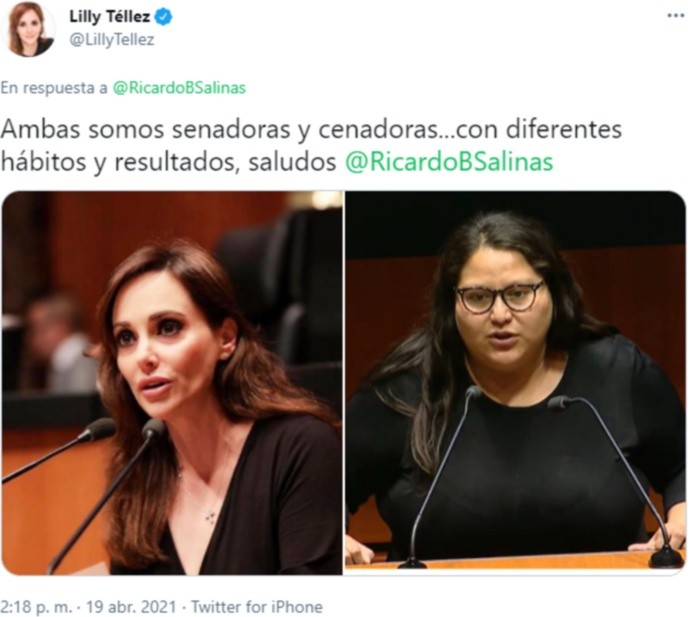 Lilly Téllez, senadora del PAN causó polémica tras lanzar un mensaje en el que hizo alusión a Citlalli Hernández, legisladora de Morena, por lo que recibió varias críticas en redes sociales.Todo comenzó con un mensaje que compartió en Twitter Ricardo Salinas Pliego en el que llama a los votantes a reflexionar su voto con una imagen: "Aviso para los votantes… 'Cuidado donde pones la cruz… porque después hay que cargarla'"."Bueno mis estimados... los dejo para ir a descansar. Por último: ¿Saben ustedes cómo se llama la diferencia entre senadora y cenadora?... Y no voy a etiquetar a nadie para que no me vayan a mal interpretar", fue el mensaje que acompañó a la imagen.A lo anterior, contestó la senadora panista Lilly Téllez con dos imágenes, una de ella y otra de Citlalli Hernández y el siguiente mensaje: "Ambas somos senadoras y cenadoras...con diferentes hábitos y resultados, saludos @RicardoBSalinas".Debido a la alusión que hizo Lilly Téllez, Citlally Hernández le contestó:"La señora Lilly Téllez cree que escudriñar mi peso es necesario para ganar algún tipo de debate. Entiendo que lo hace porque cuando intentó argumentar no pudo", respondió Citlalli Hernández con un video en el que ambas fijan su postura sobre el aborto.Mientras, los usuarios en redes sociales criticaron las expresiones de la senadora Lilly Téllez, las cuales algunos calificaron como violencia política de género y discriminatorias por referirse a la condición física de Citlalli Hernández.También reaccionaron Clara Luz Flores, candidata de Morena a la gubernatura de Nuevo León."Vergüenza me daría compartir el mismo elevador con usted, ahora imagínese ser su nieto. Degradante comportamiento el de usted, senadora Lilly Téllez", escribió Antonio Attolini, candidato a diputado federal.En respuesta a Attolini, la senadora del PAN respondió con un emoji de risa: "Imposible compartir el mismo elevador: usted va de bajada y yo en el sentido opuesto".Por su lado, Clara Luz Flores, candidata a la gubernatura de Nuevo León, envió un mensaje a Téllez: "Dirigirte así a otra mujer no solo dice mucho de tus valores, sino que replica formas de violencia de la que todas hemos sido víctimas"."Ya ni hablar de la deslealtad con la que le respondiste a un movimiento que te abrió sus puertas", agregó Flores."Candidata Flores, usted y Citlalli Hernández solo son víctimas de sí mismas", respondió la legisladora sonorense.En respuesta a la senadora del Partido del Trabajo, Geovanna Bañuelos, quien señaló que Citlalli Hernández "es una de las políticas más talentosas y congruentes que conozco", Lilly Téllez refirió que la secretaria general de Morena tiene "cero congruencia" porque "usa como bandera la defensa de las mujeres, pero dirige un partido que las denigra".OF