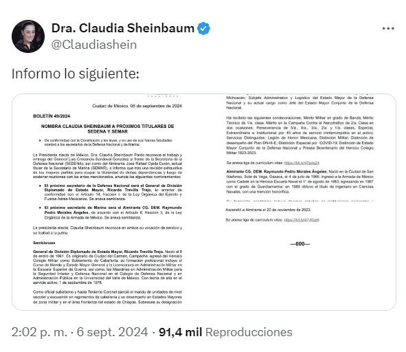 Este viernes 6 de septiembre, la presidenta electa, Claudia Sheinbaum, dio a conocer a los que serán los titulares de la Secretaría de la Defensa Nacional (Sedena) y la Secretaría de Marina (Semar) en su gabinete. En una carta, Sheinbaum agradece el trabajo del general Luis Cresencio Sandoval y el almirante José Rafael Ojeda Durán durante el gobierno de López Obrador, mientras que anunció que en sus lugares estarán el general de división, Ricardo Trevilla Trejo como secretario de Defensa, y el almirante Raymundo Pedro Morales Ángeles como titular de Marina.En el comunicado que Sheinbaum divulgó en sus redes sociales, dijo que los perfiles se eligieron tras una revisión exhaustiva para ocupar la titularidad de dichas dependencias, y después de sostener reuniones con Sandoval González y Ojeda Durán.En el documento de Claudia Sheinbaum, la mandataria electa reconoce la vocación de servicio de ambos y su lealtad a la patria.Sobre Ricardo Trevilla Trejo, indica que nació en el año de 1961 en Ciudad del Carmen, Campeche; es egresado del Heroico Colegio Militar como Subteniente de Caballería, y que su formación profesional incluye el curso de Mando y Estado Mayor General, Licenciatura en Administración Militar en la Escuela Superior de Guerra, y Maestría en Administración Militar para la Seguridad y Defensa Nacionales, en el Colegio de Defensa Nacional, así como Maestría en Administración Pública, en la Universidad del Valle de México. Su fecha de alta en el servicio activo fue el 1 de septiembre de 1978.En su perfil en la página de la Secretaría de la Defensa Nacional, destacan además:Entre sus cargos y actividades operativas:En los cargos y actividades administrativas:Sus actividades de Estado MayorSus cargos diplomáticos y comisiones en el extranjero:Entre sus condecoraciones:Sobre el almirante Raymundo Pedro Morales Ángeles informan que nació en la Ciudad de San Ildefonso, Sola de Vega, Oaxaca, el 4 de julio de 1966.La página del Centro de Estudios Superiores Navales (CESNAV) indica que tiene formación académica con diversos estudios en instituciones nacionales y extranjeras, entre los que destacan: las Maestrías en Seguridad Nacional y en Administración Naval, así como el Diplomado de Estado Mayor y las especialidades de Mando Naval y de Comunicaciones Navales, en el Centro de Estudios Superiores Navales; los diplomados en Educación con Tecnologías Telemáticas, en Evaluación de la Educación y en Seguridad Informática, y concluyó los créditos de la Maestría en Ingeniería de Sistemas (Investigación de Operaciones), en la Universidad Nacional Autónoma de México (UNAM); así mismo, realizó el Diplomado en Metodología de la Investigación en el Instituto Politécnico Nacional (IPN), y los cursos de Líneas, Antenas y Radiopropagación, y sobre el Sistema de Tierras Físicas y Pararrayos, en la Escuela Nacional de Telegrafía y Telecomunicaciones.En Estados Unidos, dice el portl, realizó los cursos de Políticas y Estrategias de Defensa en el Centro de Estudios Hemisféricos de Defensa, en la Universidad Nacional de Defensa, y los cursos para Oficial de Inspección y de Instructor en la Aplicación de las Leyes Marítimas, por la US Coast Guard.En la academia desempeñó diversos cargos relevantes, entre los que sobresalen: Coordinador de Posgrados Tecnológicos, Catedrático y Jefe de las Especialidades de Informática, Comunicaciones y Electrónica en el CESNAV.En el área operativa de la Armada de México fue Jefe de la Sección Quinta (Comunicaciones) del Estado Mayor General de la Armada; Jefe de la Sección de Operaciones y Comandante de Escuadrilla, en la Segunda Zona Naval, y Jefe de Subsección de Comunicaciones del Estado Mayor, en la Quinta Región Naval. En unidades de superficie ejerció como Oficial de Operaciones en el Buque Oceanográfico H-05 "Altaír" y en el Guardacostas G-05 "Doblado"; fungió como Segundo Comandante en los buques P-06 "Tarahumara" y D-02 "Magdalena", así como Comandante del Buque Draga ARM "BANDERAS" (ADR 01).Como funcionario de la Administración Pública Federal, en la Secretaría de Marina, fue Subdirector de Normas y Desarrollo, en la Dirección General de Comunicaciones; Inspector del Mando, en la Cuarta Zona Naval, y Director General Adjunto de Comunicaciones e Informática, este último cargo lo desempeñó hasta antes de ser nombrado Director del CESNAV.En materia diplomática fue Agregado Naval Adjunto a la Embajada de México en los Estados Unidos de América.Por su destacada trayectoria en el Servicio Activo de la Armada de México, ha recibido las siguientes condecoraciones: Mérito Docente Naval Primera Clase, Medalla Especial de la Junta Interamericana de Defensa, de la Red Interamericana de Telecomunicaciones Navales; Merito facultativo Naval Primera Clase y Segunda Clase en dos ocasiones, así como de Perseverancia de Sexta a Primera clase, por 35 años ininterrumpidos de servicio.Ha colaborado en diversas publicaciones de la Armada de México, escrito artículos en la revista del Centro de Estudios Superiores Navales y dirigido diversas tesis de maestría y especialidad, tanto en México como en los Estados Unidos de América; así mismo, ha dictado diversas conferencias sobre Seguridad Nacional, Tecnologías de la Información y Comunicaciones.*Mantente al día con las noticias, únete a nuestro canal de WhatsAppOF