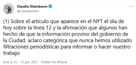 Luego que el diario The New York Times publicó una investigación sobre el Metro de la CDMX, que habla sobre que desde que inició la construcción de la Línea 12 fue una tragedia, la jefa de Gobierno de la Ciudad de México, Claudia Sheinbaum dijo que nunca en su administración han utilizado filtraciones periodísticas para informar o hacer su trabajo.El reportaje se encuentra basado en documentos gubernamentales que abarcan varios años, entrevistas con personas que trabajaron en la construcción y análisis de la evidencia del lugar del siniestro realizado por expertos, además de señalar a Marcelo Ebrard y Carlos Slim como presuntos responsables."Sobre el artículo que aparece en el NYT el día de hoy sobre la línea 12 y la afirmación que algunos han hecho de que la información provino del gobierno de la Ciudad, aclaro categóricamente que nunca hemos utilizado filtraciones periodísticas para informar o hacer nuestro trabajo. Y menos a un medio que ha buscado confrontar a la 4a Transformación", escribió en twitter.Aclaró que han sido muy responsables en esperar los dictámenes técnicos profesionales. "No es nuestro estilo filtrar información y nunca lo será. Nos caracteriza decir la verdad de forma directa sin ningún intermediario".Agregó que para la administración lo más importante es atender de forma integral a las víctimas como lo han venido haciendo y "conocer las causas de forma profesional para atender lo más pronto posible el arreglo de la línea 12. Las sanciones les corresponden a otras instancias"."¿Habría que preguntarse qué intereses no esclarecidos están detrás de este artículo?", comentó Claudia Sheinbaum tras la publicación del diario The New York Times.Este domingo, el diario estadounidense The New York Times publicó un reportaje sobre la tragedia de la Línea 12 del Metro, que señalan está basado en documentos gubernamentales, entrevistas con personas que trabajaron en la construcción del sistema de transporte y análisis de la evidencia encontrada en el lugar del siniestro.The New York Times señala que graves fallas en la construcción podrían ser la causa del colapso del tramo elevado de la estación Olivos.GC