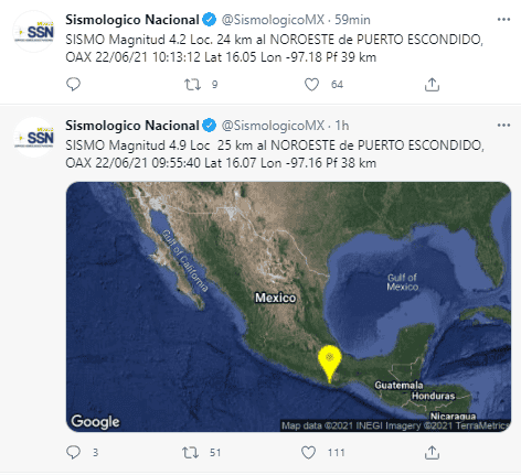 El Servicio Sismológico Nacional informó que este martes se registró un sismo magnitud 4.9 con epicentro en Puerto Escondido, Oaxaca.El movimiento telúrico fue a las 09:55 horas, al noroeste de esa localidad, informó el organismo.Vente minutos después, un segundo sismo de magnitud 4.2 grados se registró en el mismo lugar. El Sistema de Alerta Símica Mexicano indicó que no se generó una alerta porque la energía desarrollada por el sismo en los primeros segundos no superó los niveles de disparo.La Secretaría de Seguridad activó protocolos de seguridad tras el sismo. Hasta el momento no se reportan daños.NR