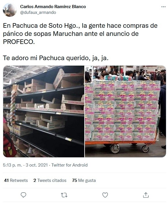 Durante el pasado fin de semana, las redes sociales dieron a conocer imágenes de una supuesta serie de compras de pánico en tiendas de conveniencia de sopas instantáneas luego de que la Procuraduría Federal del Consumidor (Profeco) anunciara el posible retiro del mercado de algunas marcas por su bajo aporte nutrimental.Los usuarios de Twitter, por ejemplo, compartieron imágenes de estantes vacíos en comercios donde las sopas instantáneas presuntamente fueron agotadas ante la posibilidad de desaparecer de la oferta en México. La cuenta @OriginalPlatano compartió una fotografía en Twitter donde se observan cajas de una marca de sopas instantáneas completamente vacías en una tienda, mientras asegura: "No era chiste. La gente hizo compras de pánico de sopas Maruchan", aunque esta misma imagen es replicada en muchas ocasiones por otros usuarios.Carlos Armando Ramírez Blanco @defaux_armando aseguró en la misma red social que la gente hacía compras de pánico en Pachuca, Hidalgo, mientras lo toma con humor.La cuenta @SoyBvip señaló que comenzó el tráfico de sopas instantáneas, al tiempo que @pugrito respondió que la imagen que compartía era falsa y que el hombre cargando un carrito lleno de producto corresponde a una situación muy parecida, pero que en 2020 se refería a un consumidor que cargaba papel higiénico, en referencia a la polémica al inicio de la pandemia sobre la compra de ese producto de higiene personal.En una imagen más real, sin un fotomontaje, @MoniqueArango difundió otro anaquel semivacío de producto. Dijo que la escena corresponde a Tijuana.El pasado 1 de octubre, la Profeco dio a conocer que prácticamente todas las marcas de sopas instantáneas que se venden en el país tienen un alto contenido de sodio, alto nivel calórico y muy bajo aporte nutrimental, por lo que sugirió la posibilidad de retirarlas del mercado. También en redes sociales llovieron críticas a la Profeco por su advertencia de retirar a las sopas instantáneas de las tiendas, pero no hacer nada con relación a la venta de alcohol o cigarro que, para muchos, son más nocivos que los productos de comida chatarra. Con memes y mensajes, usuarios señalaron su descontento con la medida y preguntaron con ironía a la autoridad qué comerán las personas que viven solas o los estudiantes foráneos que llegan a la Ciudad de México.Si te interesó esta noticia y quieres saber más, entonces descarga y descubre INFORMAPlus, la aplicación digital de EL INFORMADOR, en donde tenemos contenidos exclusivos, seleccionados por nuestros editores, para darles una experiencia más completa a los lectores.Descarga la aplicación y pruébala GRATIS por treinta días.Para iOS: https://apple.co/35jaVgb Para Android: https://bit.ly/3gwVSEVSi eres suscriptor de EL INFORMADOR tu acceso está incluido, solicítalo al 33 3678-7777OA