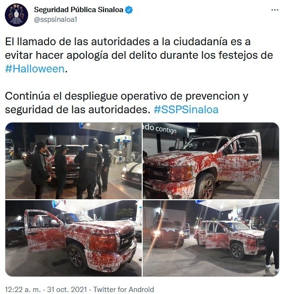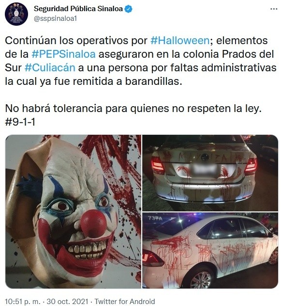 Luego de los festejos en Sinaloa por la noche de Halloween fueron detenidas en total 92 personas por hacer apología del delito. Los cuerpos de seguridad estatal y municipal en Sinaloa, en colaboración con el Ejército mexicano y la Guardia Nacional, detuvieron a un total de 92 personas y recogieron 23 vehículos durante los festejos del Halloween, por portar máscaras con armas de juguete, simular manchas de sangre en automóviles y supuestos cuerpos.La Secretaría de Seguridad Pública del Estado reportó que en los recorridos realizados, se encontró a personas conviviendo con bebidas alcohólicas en lugares públicos, paseando con disfraces y rifles de juguetes, circulando con vehículos adornados con muñecos, envueltos y supuestamente ensangrentados.Sobre la detención de veintitrés vehículos, la mayoría de ellos circulaban sin documentación adecuada y por faltas al reglamento de tránsito, por lo que fueron remitidos al corralón.Las autoridades estatales expusieron que pese a la notificación previa de que está prohibido las indumentarias y el uso de armas de juguete para hacer apología del delito, varios jóvenes fueron detenidos por no acatar esta disposición.De acuerdo al reporte las detenciones se produjeron durante la madrugada del sábado y domingo pasado, por lo que fueron turnados a barandilla, para que se les fije las sanciones económicas respectivas por violación al bando de Policía y Buen Gobierno.OA