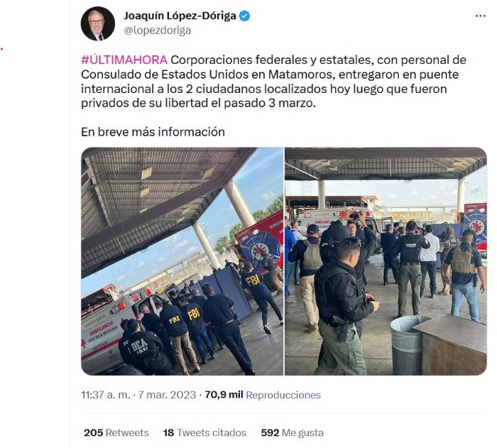 Corporaciones federales y estatales, con personal del Consulado Estados Unidos en Matamoros, entregaron en el puente internacional 2 a dos ciudadanos de aquel país localizados hoy luego que fueron privados de su libertad el pasado 3 marzo.La mañana de este martes, se confirmó que los cuatro estadounidenses secuestrados y agredidos por un comando armado durante la balacera que se vivió el 3 marzo en Matamoros fueron encontrados.El fiscal general de justicia de Tamaulipas, Irving Barrios Mojica, confirmó el hallazgo de los cuatro estadounidenses que fueron privados de su libertad el viernes pasado en Matamoros; dos de ellos ya habían fallecido.JM