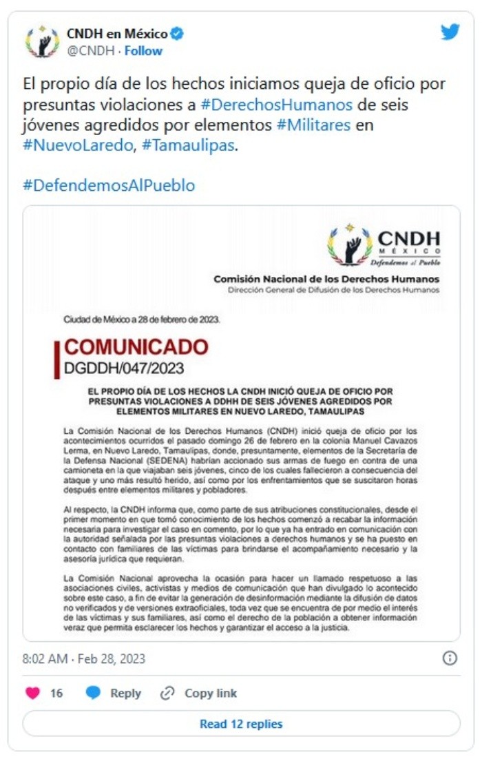 La Comisión Nacional de los Derechos Humanos (CNDH) inició una queja de oficio por los acontecimientos ocurridos este domingo en la colonia Manuel Cavazos Lerma, en Nuevo Laredo, Tamaulipas, donde presuntamente, elementos de la Secretaría de la Defensa Nacional (Sedena) accionaron sus armas de fuego contra una camioneta en la que viajaban seis jóvenes, cinco de los cuales fallecieron a consecuencia del ataque y uno más resultó herido."Este organismo realizará las labores de investigación que la ley le faculta, con toda seriedad y responsabilidad, como lo ha hecho en otros casos mediáticos y, cuando cuente con todos los elementos necesarios, emitirá los pronunciamientos que resulten pertinentes", dijo.A través de un comunicado, el organismo que dirige Rosario Piedra informó que como parte de sus atribuciones constitucionales, desde el primer momento en que tomó conocimiento de los hechos comenzó a recabar la información necesaria para investigar el caso, y aseguró que ya entró en comunicación con la autoridad señalada por las presuntas violaciones a derechos humanos y se ha puesto en contacto con familiares de las víctimas.También hizo un llamado a las asociaciones civiles, activistas y medios de comunicación que han divulgado lo acontecido sobre este caso, para evitar generar desinformación mediante la difusión de datos no verificados y de versiones extraoficiales, toda vez que se encuentra de por medio el interés de las víctimas y sus familiares, así como el derecho de la población a obtener información veraz que permita esclarecer los hechos y garantizar el acceso a la justicia.JM