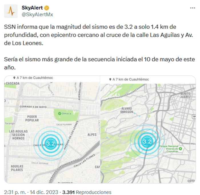 Dos microsismos más se sintieron este jueves 14 de diciembre en la Ciudad de México (CDMX), sin que hasta el momento se reporten daños de consideración.Tal como sucedió el pasado 12 de diciembre, algunas alcaldías de la CDMX percibieron el temblor.El Servicio Sismológico Nacional informó, a través de su cuenta de Twitter, que en el primer microsismo el epicentro fue en la alcaldía Magdalena Contreras y la magnitud de 3.2.El segundo, en la alcaldía Álvaro Obregón y su magnitud fue de 2.4. Entre uno y otro, sólo hubo dos minutos de diferencia.En la ciudad ya comenzaron a aplicarse los protocolos correspondientes. Muchos habitantes reportaron que no percibieron el movimiento telúrico, como tampoco escucharon las alertas sísmicas.Por su parte, SkyAlert informó que se trata del sismo más grande de la secuencia iniciada el 10 de mayo de este año.* * * Mantente al día con las noticias, únete a nuestro canal de WhatsApp * * *OA