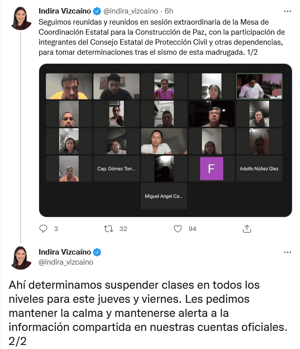 Tras el temblor de la madrugada de este jueves, de magnitud 6.9, las autoridades de Colima decidieron suspender las clases hoy y mañana viernes en todos los niveles de educación.Era la una de la mañana con 16 minutos cuando un nuevo sismo sacudió Michoacán, Colima, Jalisco, Guerrero y Ciudad de México, con epicentro otra vez en el municipio de Coalcomán.La gobernadora Índira Vizcaíno, informó en redes sociales que determinaron "suspender clases en todos los niveles para este jueves y viernes. Les pedimos mantener la calma y mantenerse alerta a la información compartida en nuestras cuentas oficiales".Además, señaló que en la Mesa de Coordinación Estatal determinaron que, tras el sismo de esta madrugada, elementos de todas las corporaciones salieran a hacer recorridos y labores de cercanía y auxilio de personas en toda la entidad.Hasta el momento no hay un parte oficial de los daños en la entidad, una de las más afectadas por el sismo del pasado lunes de 7.7 grados.OF