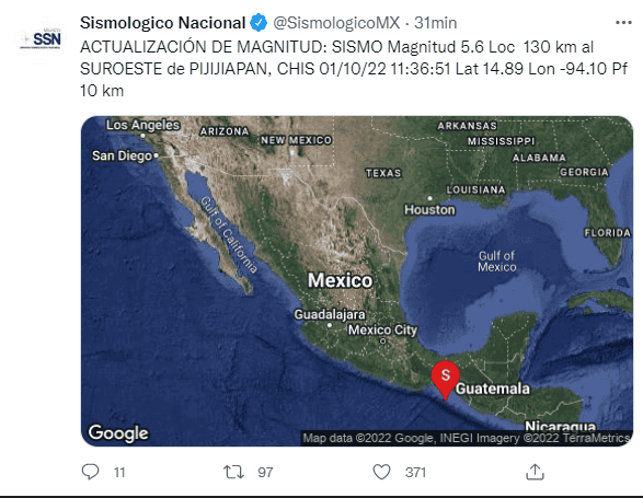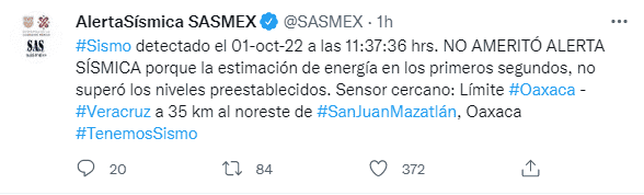 Aunque el mes de septiembre ya finalizó y con ello, se pensaría, también los sismos, este mes de octubre inició con otro temblor, que se registró en Pijijiapan, Chiapas, con una magnitud de 5.8, según informó el Servicio Sismológico Nacional (SSN).Por su parte, el Sistema de alerta sísmica mexicano (Sasmex) informó que detectó un sismo hoy a las 11:37:36 hrs, sin embargo: "NO AMERITÓ ALERTA SÍSMICA porque la estimación de energía en los primeros segundos, no superó los niveles preestablecidos".Hasta el momento se desconoce si hay daños por el temblor, aunque en la capital del país, algunos ciudadanos aseguraron que sí sintieron el sismo e incluso, subieron videos a redes sociales.El Sismológico Nacional también informó este sábado que suman cuatro mil 211 réplicas registradas del sismo ocurrido el pasado 19 de septiembre en Michoacán, mismo que se percibió en varios estados del país como CDMX y Jalisco. GC