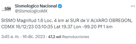El Servicio Sismológico Nacional (SSN) informó que un microsismo de magnitud 1.6 se registró, otra vez, en la alcaldía Álvaro Obregón a las 03:10 horas de este sábado 16 de diciembre de 2023.Durante toda la semana, estos fenómenos se han percibido en esa alcaldía, además de la Benito Juárez, en donde se han revisado 38 revisiones de edificios habitacionales, públicos y escuelas, tras los sismos del 12 de diciembre que se registraron en la Ciudad de México.Sin embargo, de ese número de casas y edificios se determinó desalojar ocho para garantizar la integridad de las personas, según especialistas del Instituto para la Seguridad de las Construcciones de la Ciudad de México.Los ocho inmuebles, ubicados en las colonias Mixcoac e Insurgentes Mixcoac son: Los Echave 11, Campana 21, 29 y 35, Donatello 65 y 68, Av. Revolución 959 y Boulevard Adolfo López Mateos 91.*Mantente al día con las noticias, únete a nuestro canal de WhatsAppOF