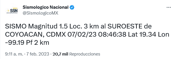 La mañana de este martes, usuarios de redes sociales indicaron haber percibido un temblor hoy en la Ciudad de México.Minutos después, el Servicio Sismológico Nacional (SSN) confirmó la información, señalando que el micro sismo tuvo epicentro a tres kilómetros de Coyoacán, y una magnitud de 1.5, a las 08:46 horas.El temblor de baja magnitud fue percibido debido a que se registró a una profundidad de dos kilómetros.De acuerdo con la plataforma SkyAlert, el sismo no ameritó alertamiento.El temblor de hoy tuvo percepción en colonias San Ángel, Nápoles y Mixcoac, entre otras.OF