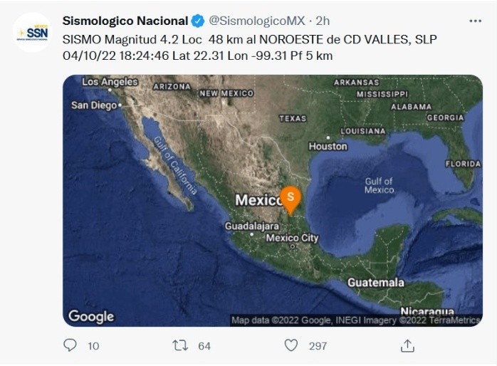 El Servicio Sismológico Nacional reportó un sismo en Ciudad Valles, en la región Huasteca de San Luis Potosí.De acuerdo al primer reporte, la magnitud fue de 4.2 con epicentro a 48 kilómetros al noreste de Ciudad Valles.Información preliminar apunta a que en Ciudad Valles la percepción del movimiento fue menor.Protección Civil del estado y del municipio de Ciudad Valles se encuentran recorriendo la zona respecto a posibles daños en edificios y estructuras.JM