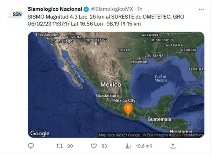 El Servicio Sismológico Nacional informó sobre un sismo al sureste de Ometepec, Guerrero, con magnitud de 4.9 grados, aunque luego el dato fue corregido.El temblor fue registrado a las 11:33 horas con una latitud de 16.54°, longitud de -98.24° y profundidad de 10 kilómetros. Hasta las 12:05 horas, las redes sociales del gobierno de Guerrero, Protección Civil o de la gobernadora, Evelyn Salgado, no se han pronunciado al respecto.Luego del primer reporte, el Sismológico ajustó e informó que la magnitud del sismo fue de 4.3 grados.JM