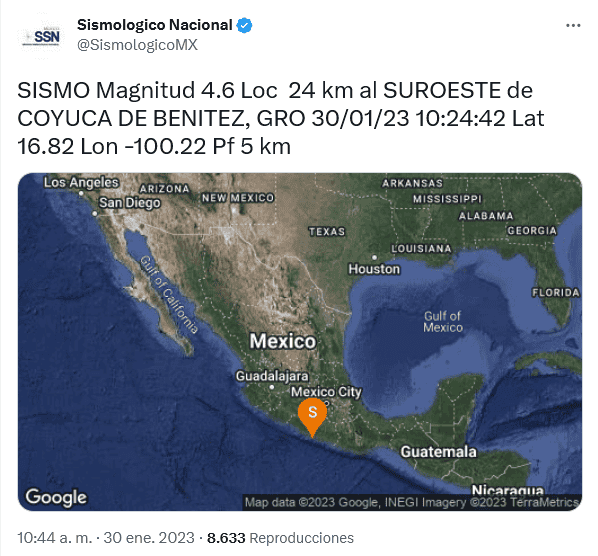La mañana de este lunes 30 de enero se registró un temblor con epicentro en el estado de Guerrero. El sismo fue notificado por diferentes aplicaciones.En sus redes sociales, el Servicio Sismológico Nacional (SSN) indicó que el temblor de hoy registró una magnitud de 4.6, con epicentro a 24 kilómetros al suroeste de Coyuca de Benítez, a una profundidad de 5 kilómetros.Según SASSLA, la plataforma digital de Alertamiento de Riesgos en México, el temblor no ameritó la alerta sísmica en la Ciudad de México.Hasta el momento no se tienen reportes de daños.OF