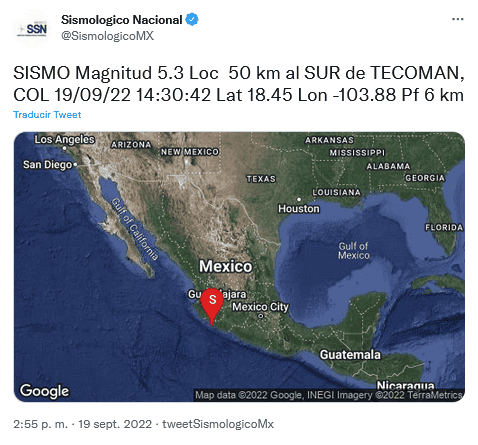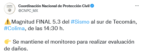 Después de que se registrara un sismo este 19 de septiembre en Coalcomán, Michoacán, se reportó un temblor de magnitud 5.3 en Tecomán, Colima.El temblor ocurrió a las 14:30 horas, con epicentro a 50 kilómetros del mencionado municipio. El Servicio Sismológico Nacional reportó una magnitud preliminar de 5.1, luego ajustó a 5.3.La Coordinadora Nacional de Protección Civil dijo en sus redes sociales que se mantiene el monitoreo para realizar evaluación de daños.Hasta el momento, no se ha informado si se trate de alguna réplica.OF