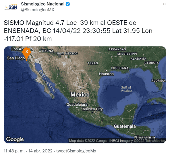 La noche de ayer miércoles, minutos antes de que iniciara el Viernes Santo, un temblor de magnitud 4.7 se registró en el estado de Baja California, según información del Servicio Sismológico Nacional. El sismo de ayer se localizó 39 kilómetros al oeste de Ensenada, Baja California, a las 23:30 horas, sin embargo no fue el único, pues minutos después, a las 23:46 se registró otro temblor de magnitud 3.3 al sur de las playas de Rosarito. Estos movimientos telúricos se percibieron en gran parte de Baja California, como en Ensenada, Rosarito y Tijuana.Según Protección Civil de Baja California, el temblor se sintió de moderado a fuerte en Ensenada, Rosarito y Tijuana, mientras que en Tecate fue moderado y leve en Mexicali. La corporación informó que no hubo daños estructurales o personas afectadas por el sismo registrado ayer por la noche.