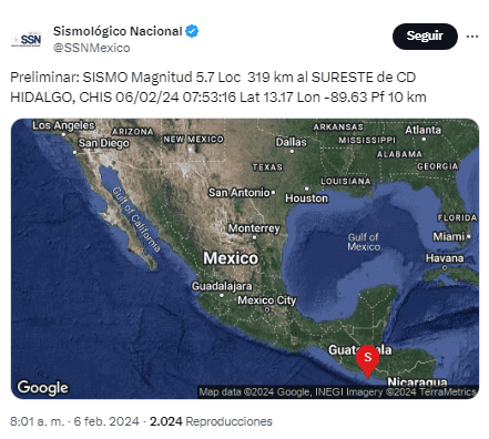 La mañana de este martes 6 de febrero se registró un temblor de magnitud preliminar 5.7 a 319 km sureste del municipio de Ciudad Hidalgo, en Chiapas.En un mensaje publicado en su cuenta de X (antes Twitter), el Servicio Sismológico Nacional (SSN) señaló que el sismo ocurrió a las 07:53 horas, a una profundidad de 10 kilómetros.En sus cuentas oficiales, el presidente de El Salvador, Nayib Bukele, indicó que el temblor tuvo origen en la costa de ese país. Pidió mantener la calma mientras se monitorea para descartar riesgos.Por su parte, el Ministerio de Medio Ambiente de El Salvador indicó que el temblor de 5.7 tuvo epicentro a 72 kilómetros al sur de la playa Los Cóbanos. Descartan alerta de tsunami por el momento.*Mantente al día con las noticias, únete a nuestro canal de WhatsApp OF