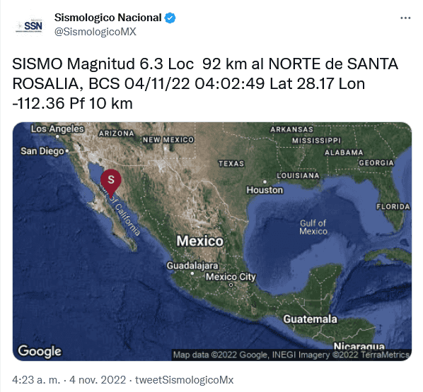 Un temblor hoy despertó a habitantes de Baja California, Baja California Sur y Sonora.Según el Servicio Sismológico Nacional (SSN), el sismo, de magnitud 6.3, tuvo epicentro a 92 kilómetros al norte de Santa Rosalía, BCS, en el mar de Cortés, y ocurrió a las 04:02 de la mañana.Reportes de redes sociales indican que el temblor se percibió de manera fuerte en localidades cercanas al Golfo de California.En sus redes sociales, la Coordinación Nacional de Protección Civil (CNPC) aseguró que hasta el momento no se reportan afectaciones, y que continúan monitoreando las zonas.OF