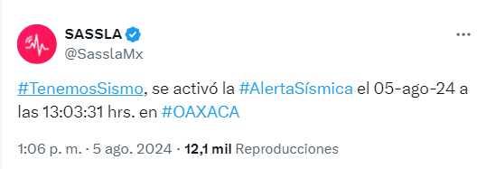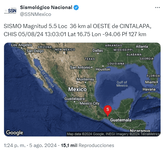 Este lunes 5 de agosto, se registró un sismo de magnitud preliminar de 6.3 en Chiapas.De manera preliminar, el Servicio Sismológico Nacional (SSN) dijo que el temblor se registró a 36 km al noroeste del municipio de Arriaga a las 13:02:58 horas.Más tarde, el SSN ajustó a 5.5 la magnitud final del temblor, y el epicentro a 36 km al oeste de Cintalapa.Al respecto, la Coordinación Nacional de Protección Civil dijo que no se reportan afectaciones en los estados donde fue percibido, y que de acuerdo con usuarios de redes sociales fue en algunos puntos de la Ciudad de México, Puebla, Tabasco y Veracruz, además de Chiapas y Oaxaca.La Plataforma Digital de Alertamiento y Gestión Integral de Riesgos SASSLA, dice que debido a este temblor, se activó la alerta sísmica en Chiapas, además del estado de Oaxaca.Algunos edificios fueron desalojados ante el fenómeno sin que se reportaran mayores problemas.*Mantente al día con las noticias, únete a nuestro canal de WhatsApp OF