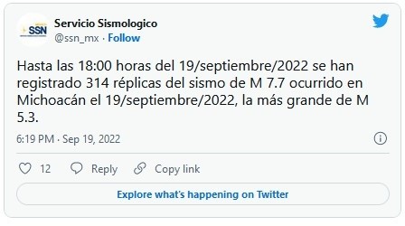 Luego de reportar el sismo de 7.4 de esta tarde, el Servicio Sismológico Nacional ajustó el sismo a 7.7; contabiliza hasta 314 réplicas, la más grande de 5.3 grados.En su reporte especial, el Sismológico Nacional reportó que "el día 19 de septiembre de 2022 el Servicio Sismológico Nacional (SSN) reportó un sismo con magnitud 7.7 localizado en las cercanías de Coalcomán, en el estado de Michoacán. El sismo, ocurrido a las 13:05:09 horas, fue sentido en Coalcomán y en otras localidades del estado de Michoacán. Las coordenadas del epicentro son 18.24 latitud N y -103.29 longitud W y la profundidad es de 15 km".Dice además que "El mecanismo focal del evento se muestra en la Figura 3 y corresponde a una falla de tipo inverso, en la que el bloque de techo sube con respecto al bloque de piso. Este tipo de mecanismos de ruptura es frecuente en los sismos interplaca y potencialmente tsunamigénicos".Dice además que "La actividad sísmica en el estado de Michoacán es intensa. Históricamente, grandes terremotos han ocurrido a lo largo de la costa de este estado como consecuencia de la subducción de la placa de Cocos por debajo de la placa de Norteamérica" ."De gran importancia son los terremotos del 19 y 20 de septiembre 1985 de magnitud 8.1 y 7.6, respectivamente, ubicados en la interfaz entre las placas de Cocos y Norteamérica. Estos ocasionaron daños importantes en una amplia zona del centro del país y principalmente la Ciudad de México". JM