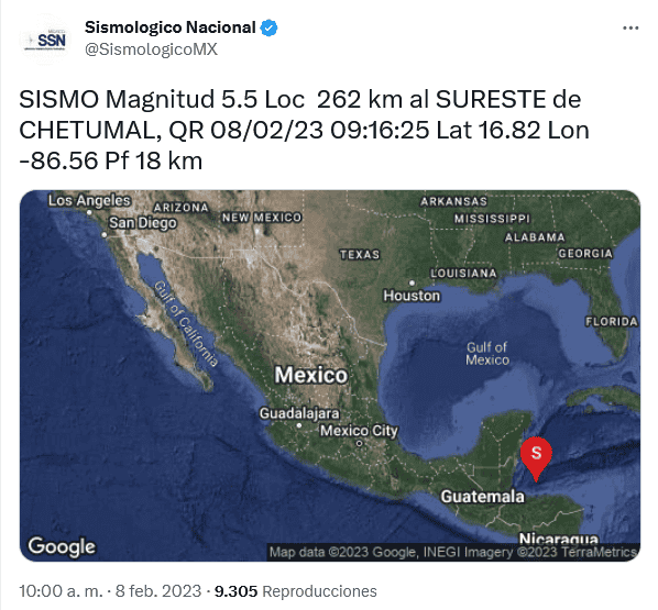 Este miércoles 8 de febrero, un sismo se registró en el mar caribe a las 09:16 horas, y fue percibido en el estado de Quintana Roo.De acuerdo con el Servicio Sismológico Nacional (SSN), el temblor de hoy tuvo una magnitud de 5.5, y tuvo epicentro a 262 kilómetros de Chetumal, a una profundidad de 18 kilómetros.En sus redes sociales, la Coordinadora Nacional de Protección Civil indicó que "A partir de este evento, mantenemos comunicación con las unidades estatales y municipales de #ProtecciónCivil, para realizar una evaluación preliminar de la zona".Por otra parte, la estatal Comisión Permanente de Contingencias (Copeco) de Honduras, dijo que el sismo se sintió en varias regiones del país, así como en Guatemala, Belice, y Nicaragua.Pobladores de Roatán, lo mismo que de La Ceiba y Tocoa, en la región costera del Caribe hondureño, indicaron a medios locales de prensa que sintieron el temblor.En La Ceiba, muchos empleados de oficinas públicas y privadas salieron alarmados a la calle.Personal del Cuerpo de Bomberos inspeccionó el edificio de la Municipalidad de La Ceiba, pero ninguna autoridad ha informado de daños materiales, ni víctimas mortales.OF
